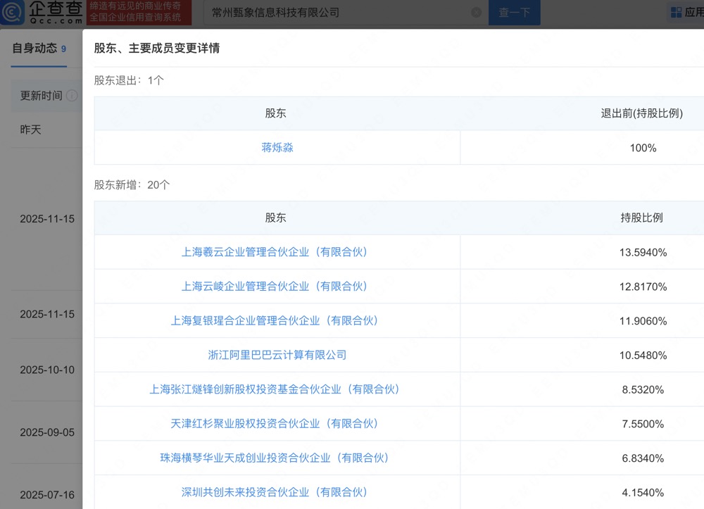 企查查APP显示,近日,常州甄象信息科技有限公司发生工商变更,蒋烁淼退出该公司股东,新增浙江阿里巴巴云计算有限公司、上海羲云企业管理合伙企业(有限合伙)、上海云绾企业管理咨询合伙企业(有限合伙)等为股东。企查查信息显示,该公司成立于今年4月,法定代表人为蒋烁淼,经营范围包括信息咨询服务、软件开发、货物进出口等。