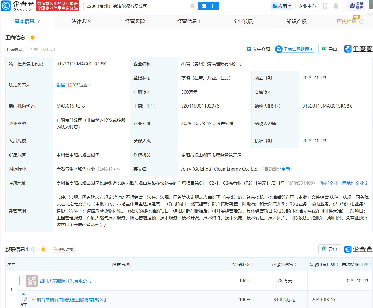 企查查APP显示,近日,杰瑞(贵州)清洁能源有限公司成立,法定代表人为谢猛,经营范围包含:燃气经营;矿产资源勘查;陆地石油和天然气开采;发电业务、输电业务、供(配)电业务等。企查查股权穿透显示,该公司由杰瑞股份(002353)间接全资持股。