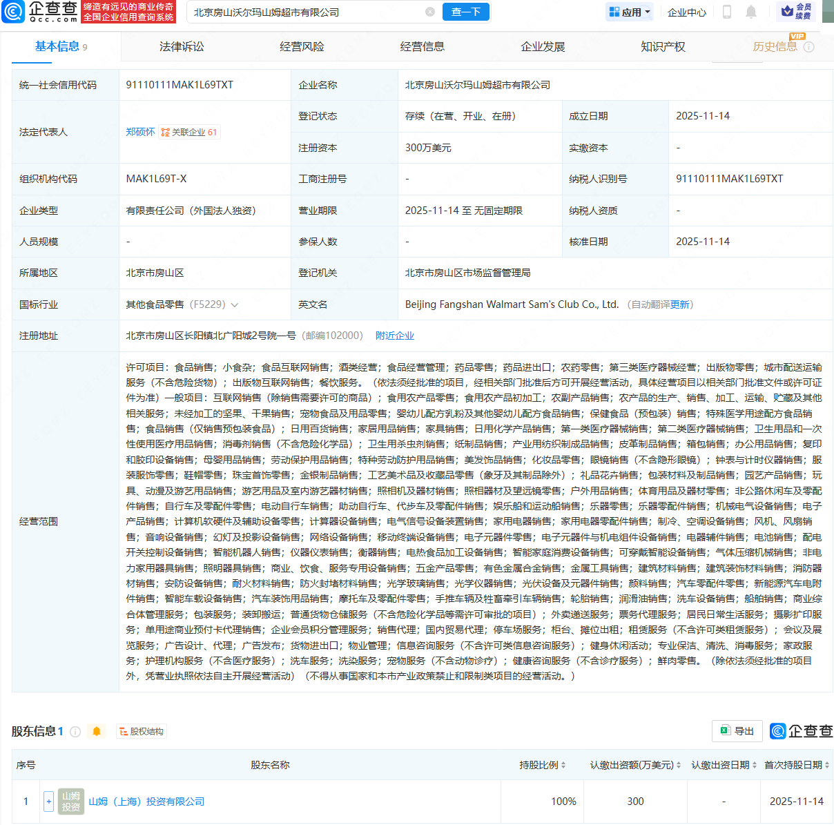 企查查APP显示,近日,北京房山沃尔玛山姆超市有限公司成立,法定代表人为郑硕怀,注册资本为300万美元,经营范围包含:食品销售;小食杂;食品互联网销售;酒类经营;食品经营管理;药品零售;药品进出口等。企查查股权穿透显示,该公司由山姆(上海)投资有限公司全资持股。