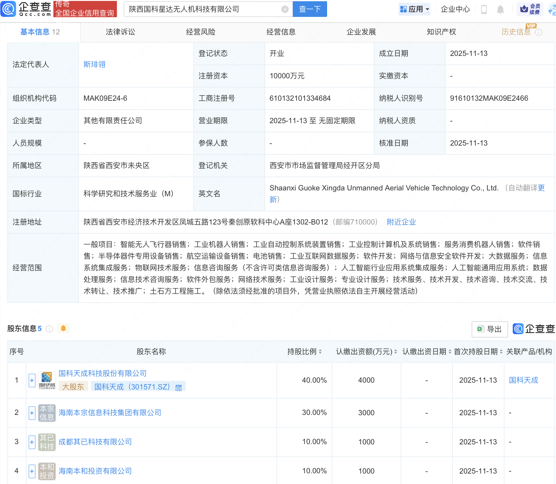 企查查APP显示,近日,陕西国科星达无人机科技有限公司成立,注册资本1亿元,经营范围包含:智能无人飞行器销售;工业机器人销售;人工智能行业应用系统集成服务;人工智能通用应用系统等。企查查股权穿透显示,该公司由国科天成(301571)等共同持股。
