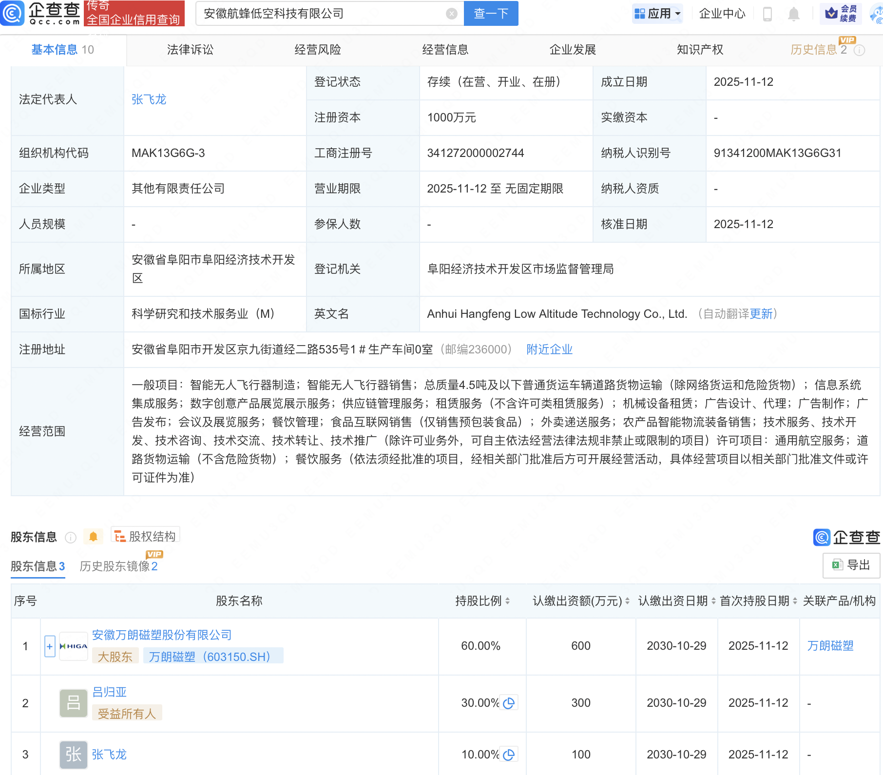 企查查APP显示,近日,安徽航蜂低空科技有限公司成立,注册资本1000万元,经营范围包含:智能无人飞行器制造;智能无人飞行器销售;信息系统集成服务;数字创意产品展览展示服务等。企查查股权穿透显示,该公司由万朗磁塑(603150)等共同持股。