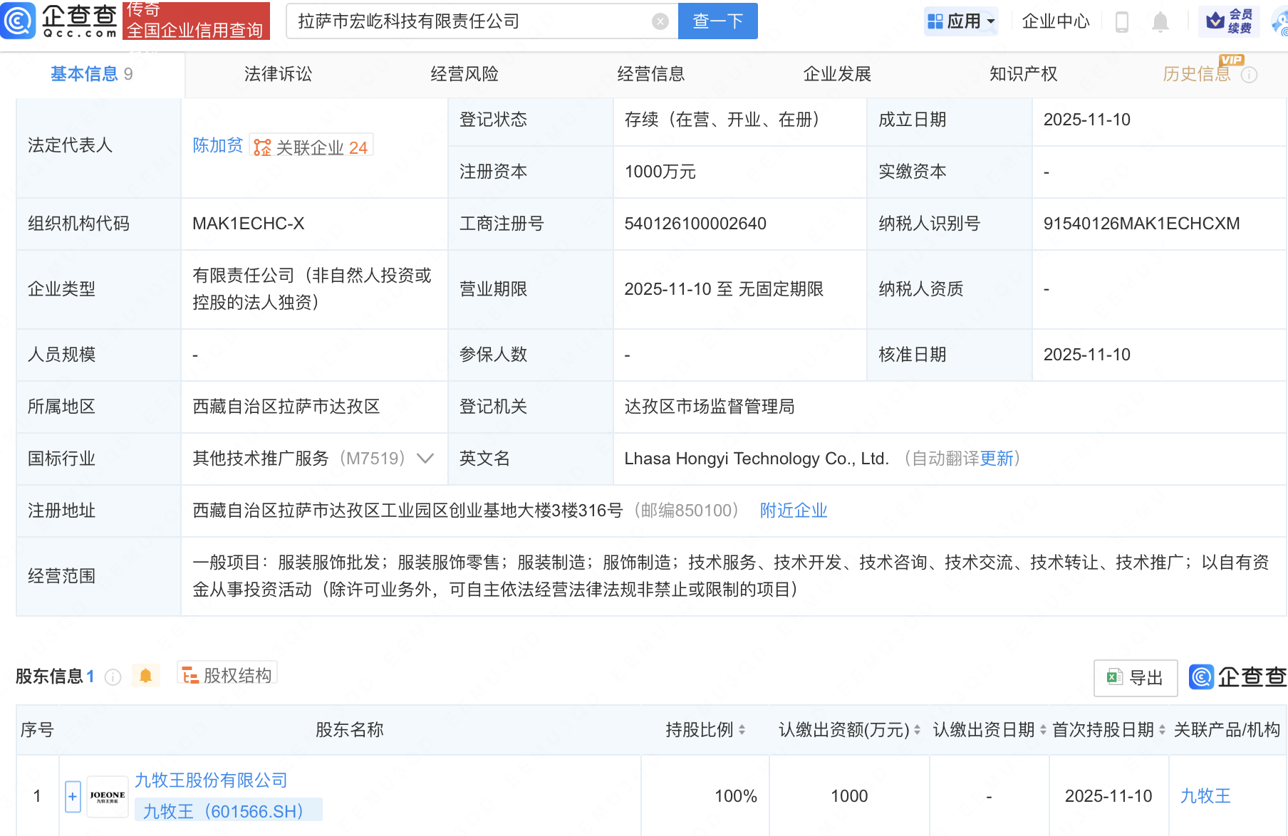 企查查APP显示,近日,拉萨市宏屹科技有限责任公司成立,注册资本1000万元,经营范围包含:服装服饰批发;服装服饰零售;以自有资金从事投资活动等。企查查股权穿透显示,该公司由九牧王(601566)全资持股。