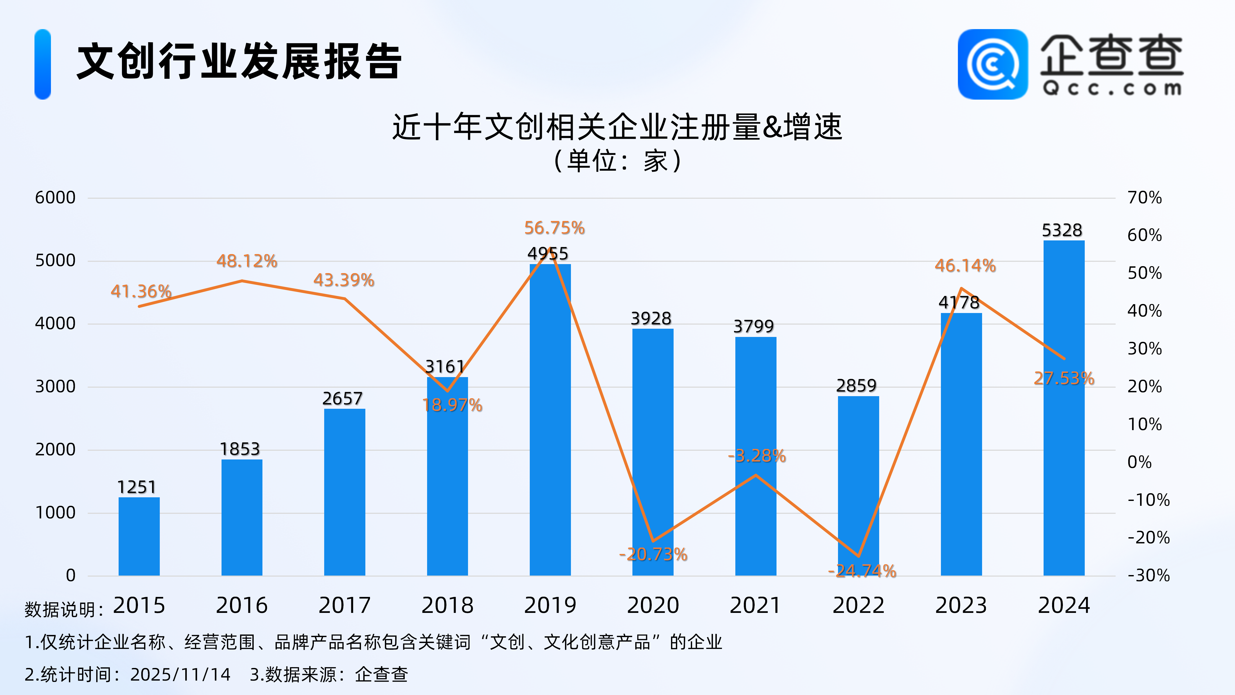 企查查数据显示,注册量方面,近十年相关企业注册量呈整体增长态势,其中2019年全年注册4955家,同比增长56.75%,达近十年注册增速峰值。2024年全年注册5328家文创相关企业,同比增长27.53%。
