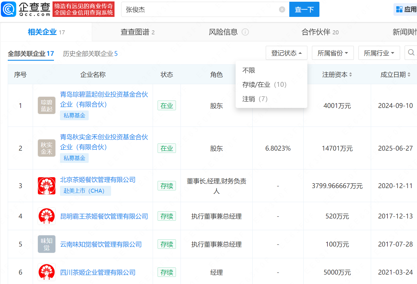 企查查APP显示,张俊杰名下共关联17家企业,其中10家处于存续状态,包括北京茶姬餐饮管理有限公司、青岛琮碧蓝起创业投资基金合伙企业(有限合伙)、昆明霸王茶姬餐饮管理有限公司等,张俊杰在上述公司担任董事长、执行董事、总经理等职务。高海纯名下关联29家企业,包括海南锐阳创业投资合伙企业(有限合伙)、上海元合时代智能科技有限公司等,目前两人暂无商业关联。
