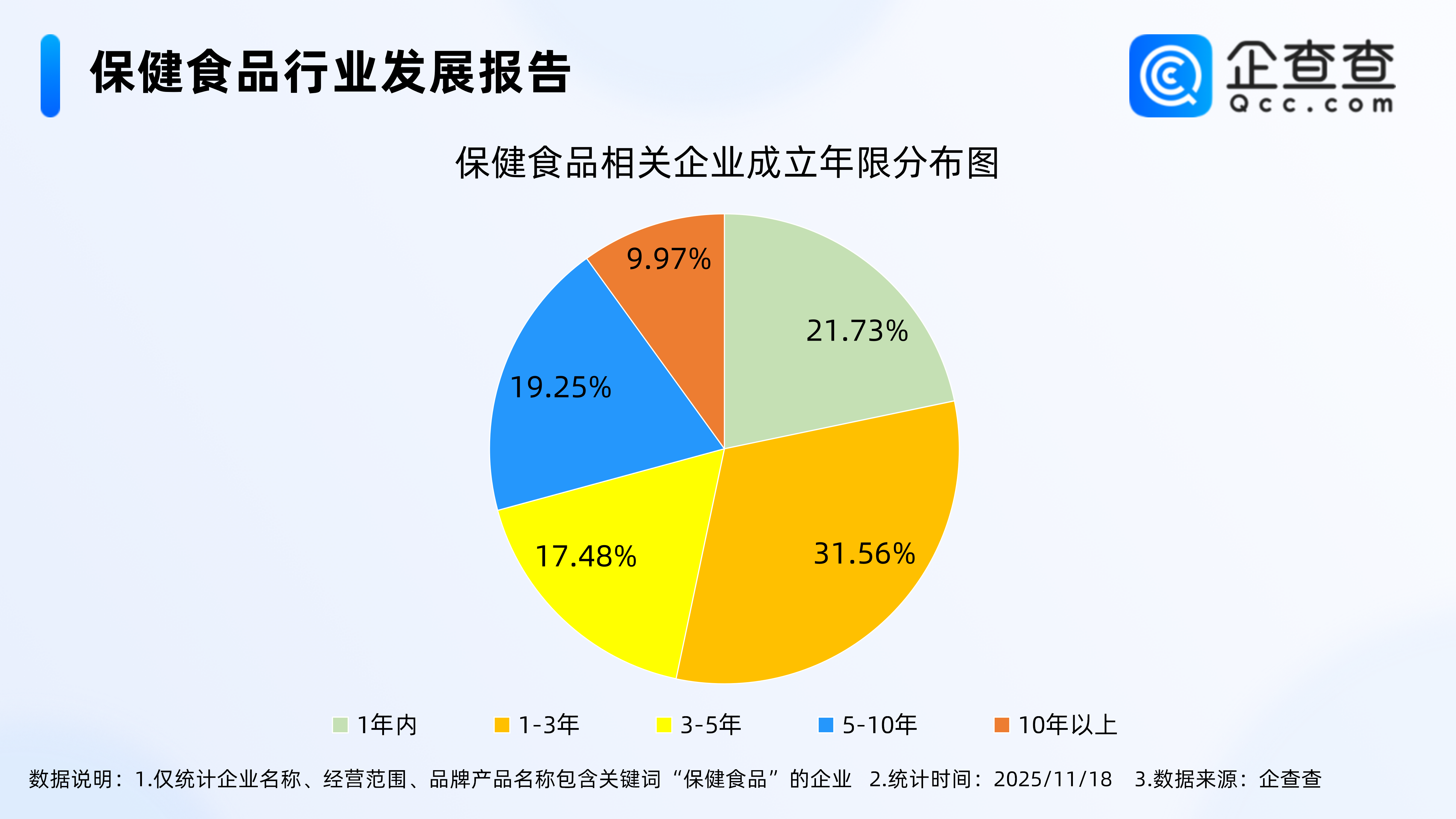 企查查数据显示,从经营时间来看,保健食品相关企业多成立于近三年,成立年限在1-3年的相关企业最多,占比31.56%。其次,成立年限在1年内、5-10年的相关企业分别占比21.73%、19.25%。