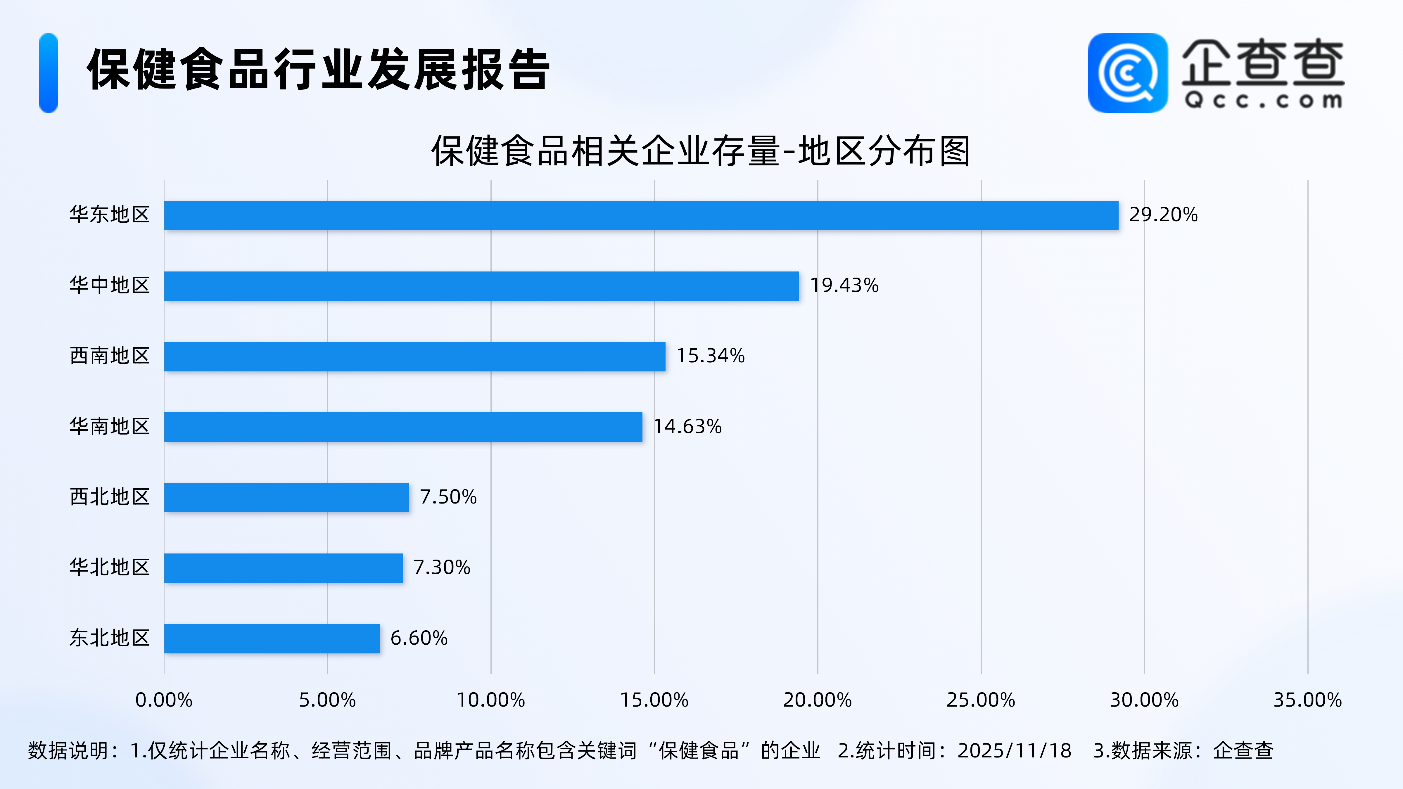 企查查数据显示,从地区分布来看,保健食品相关企业多分布在华东地区,占比达29.20%。其次,分布在华中地区、西南地区的保健食品相关企业分别占比19.43%、15.34%。