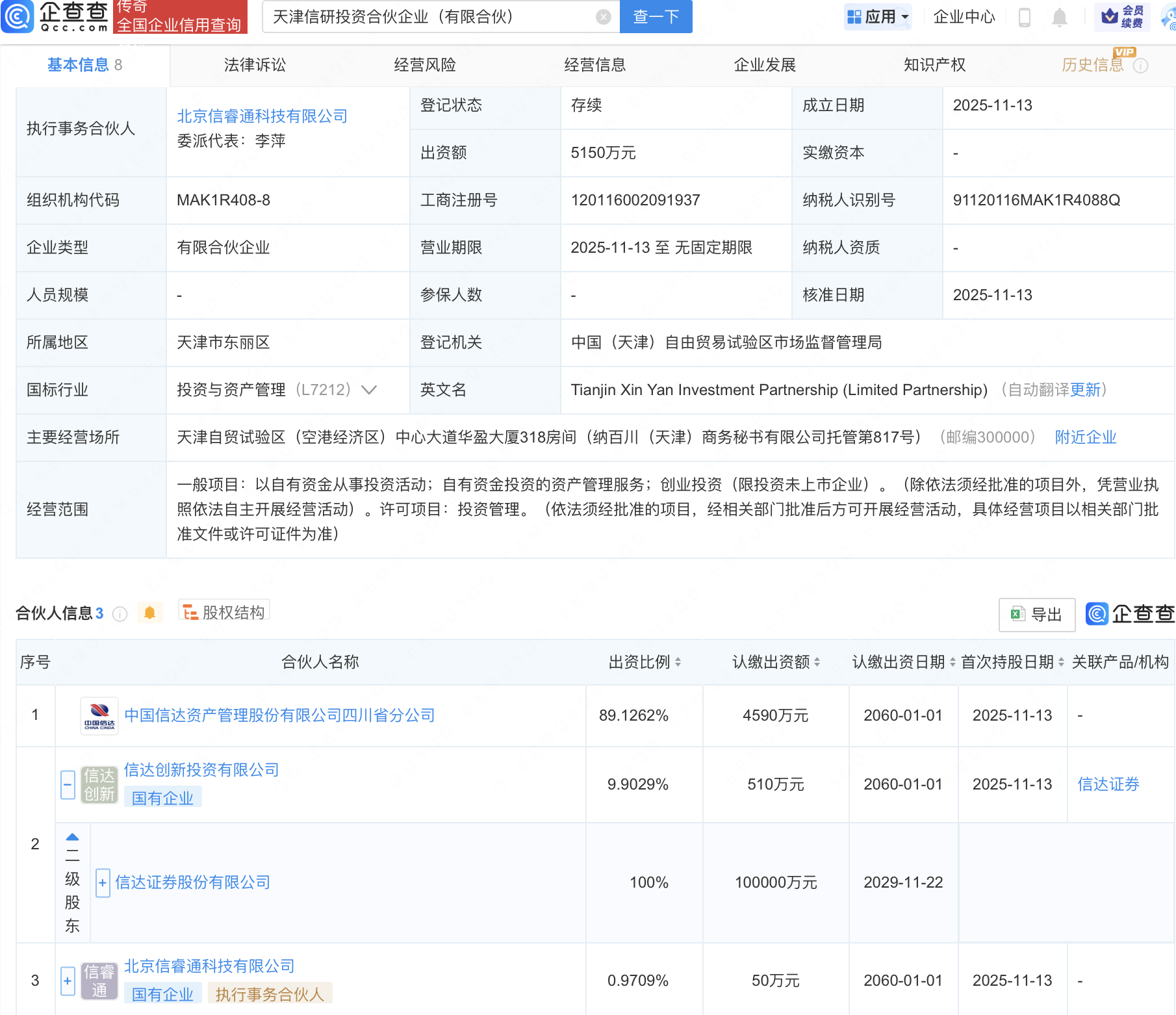 企查查APP显示,近日,天津信研投资合伙企业(有限合伙)成立,经营范围包含:以自有资金从事投资活动;自有资金投资的资产管理服务;创业投资(限投资未上市企业)等。企查查股权穿透显示,该企业由信达证券(601059)全资子公司信达创新投资有限公司等共同出资。