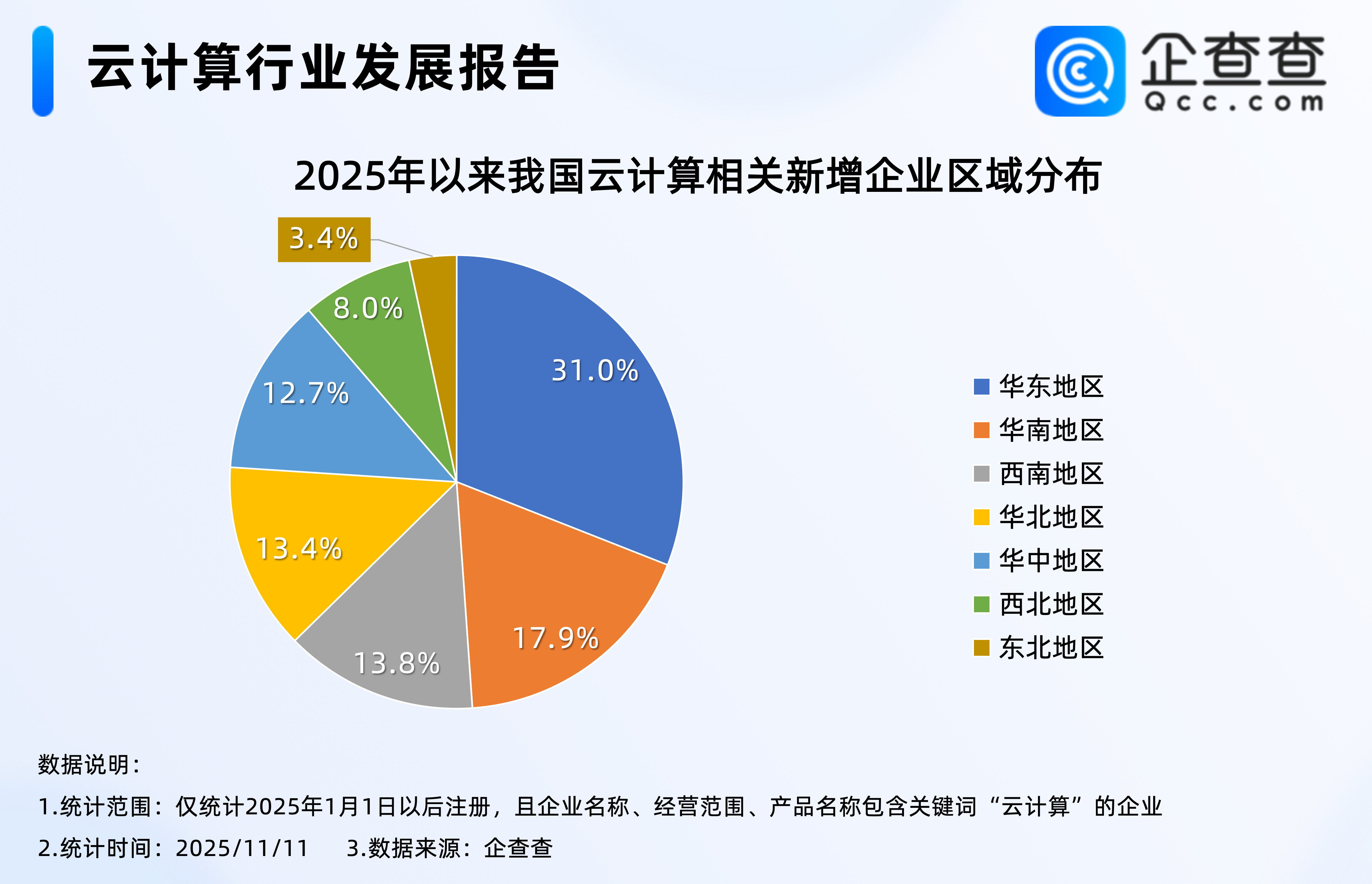 企查查数据显示,2025年新注册的14万家云计算相关企业中,超三成位于华东地区,其次是华南、西南地区,分占17.9%、13.8%;东北地区云计算相关企业相对较少,占比3.4%。