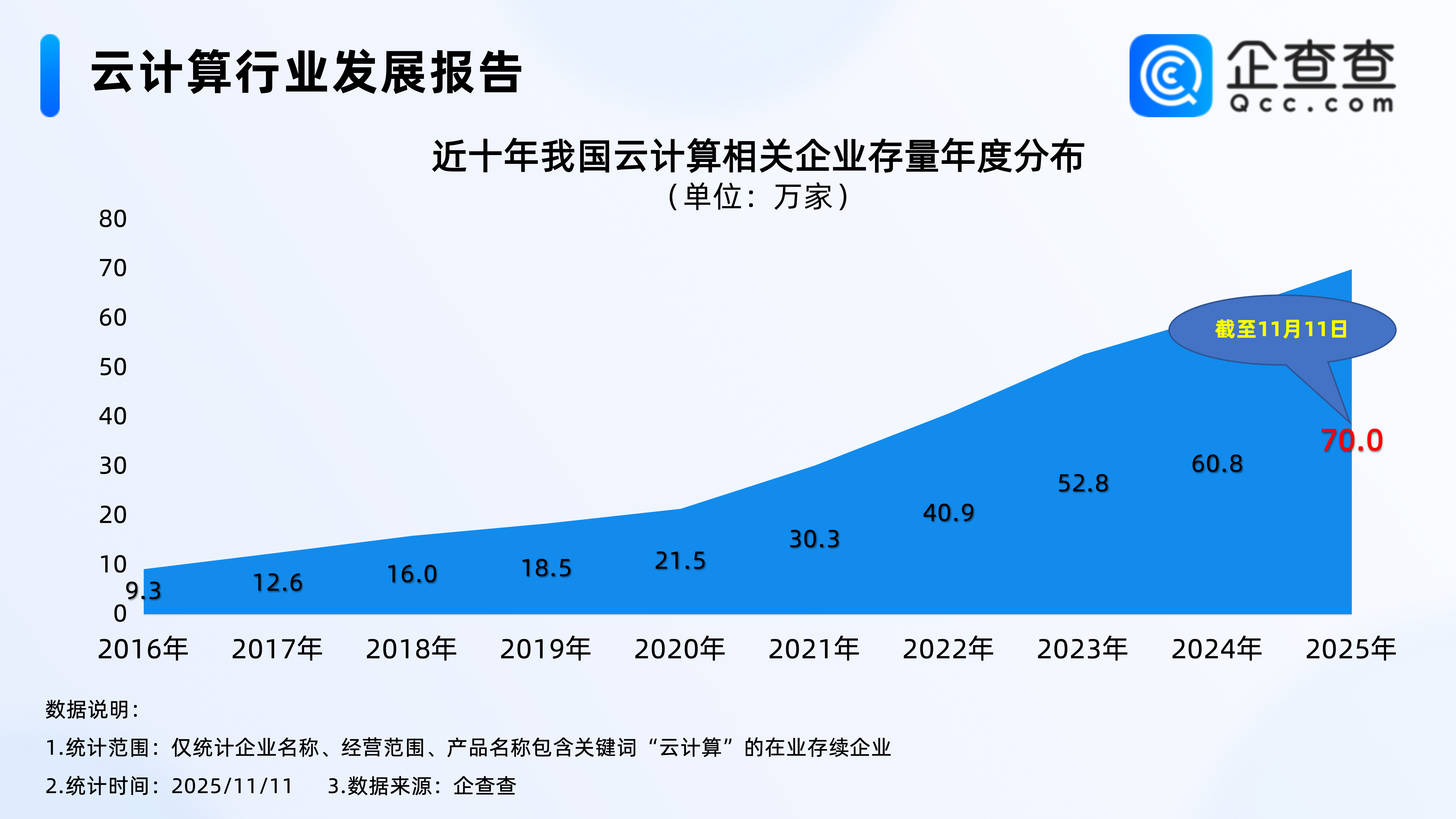 企查查数据显示,2016年以来,我国云计算相关企业存量逐年增加,并于2020年规模扩张加快,2023年我国云计算相关企业存量正式突破50万家,截至11月11日,我国现存云计算相关企业突破70万家。
