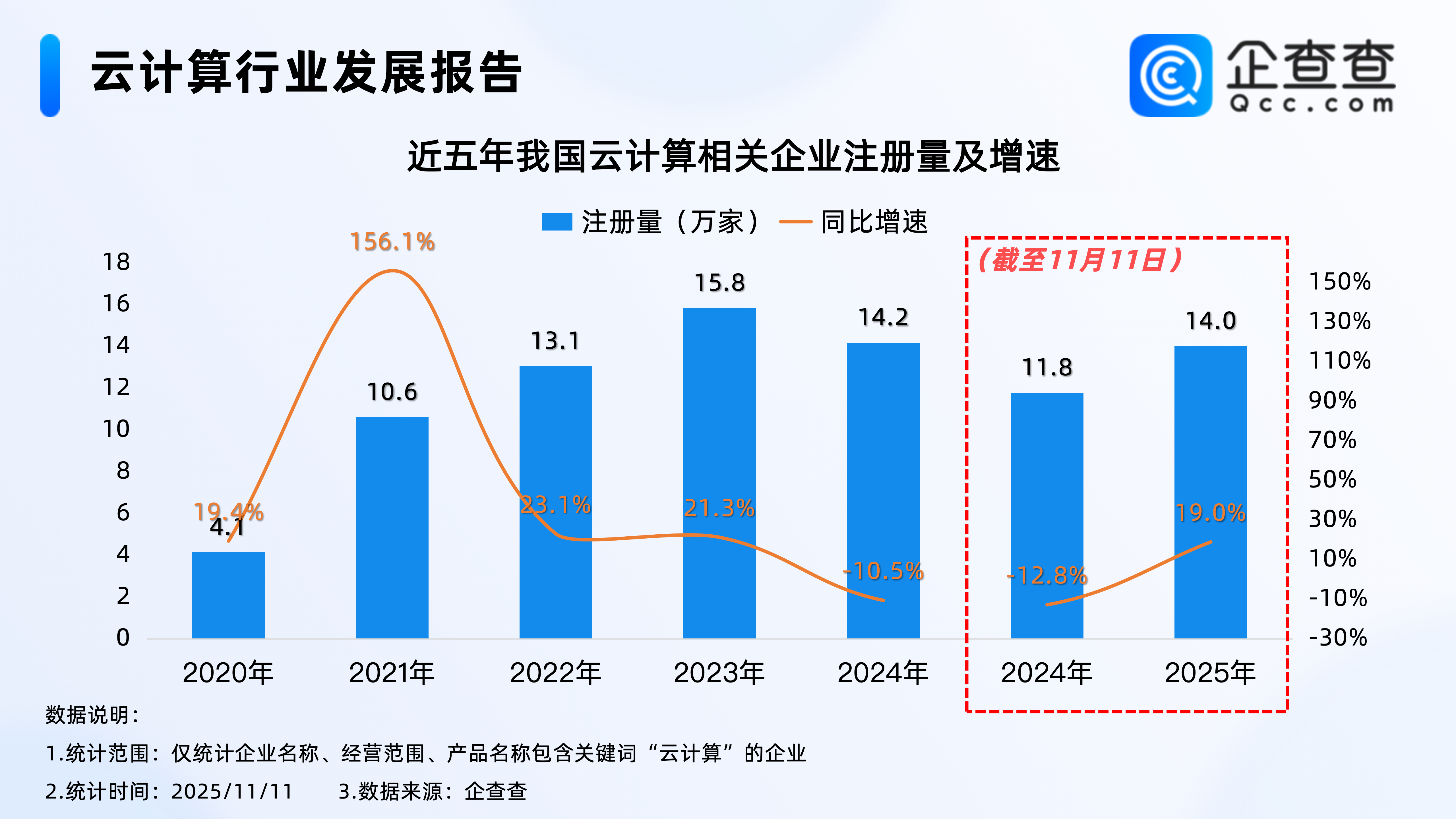 企查查数据显示,2020年至2023年,我国云计算相关企业每年注册量逐年增加,2023年注册量同比增加21.3%至15.8万家,达近五年相关企业注册量峰值;2024年全年,我国累计注册14.2万家云计算相关企业。截至11月11日,2025年我国已注册14.0万家云计算相关企业,相比2024年同期增加19.0%。