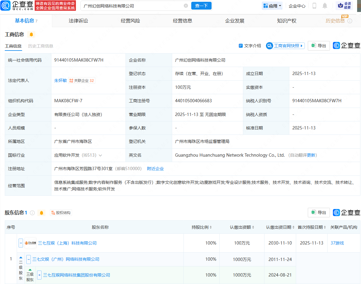 企查查APP显示,近日,广州跃虎网络科技有限公司、广州幻创网络科技有限公司成立,经营范围均包含:信息系统集成服务;数字内容制作服务(不含出版发行);数字文化创意软件开发;动漫游戏开发等。企查查股权穿透显示,两公司均由三七互娱(002555)间接全资持股。