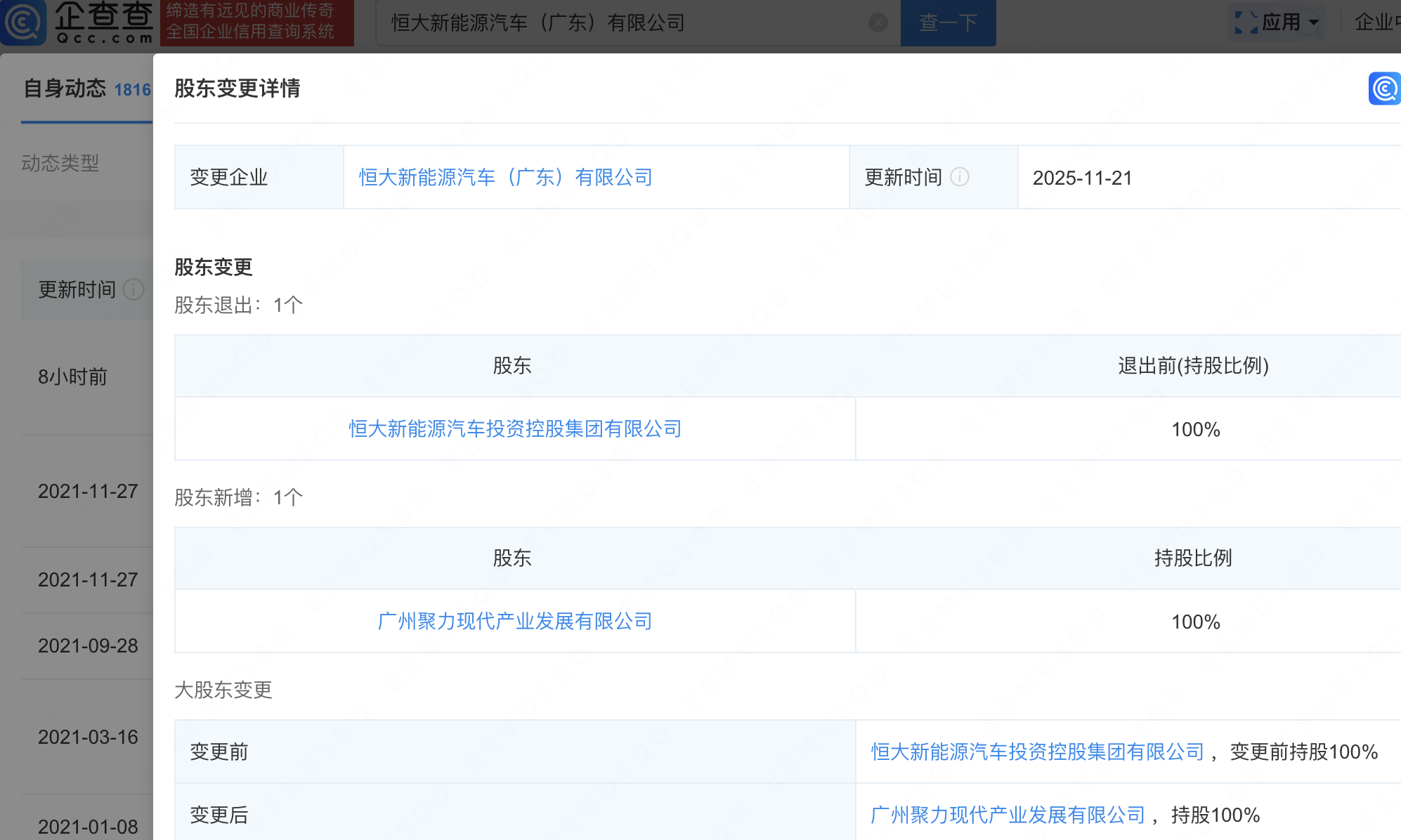 企查查APP显示,近日,恒大智能汽车(广东)有限公司、恒大新能源汽车(广东)有限公司发生工商变更,原股东恒大新能源汽车投资控股集团有限公司退出,新增国有企业广州聚力现代产业发展有限公司为全资股东。企查查信息显示,恒大智能汽车(广东)有限公司成立于2018年,注册资本25亿元,恒大新能源汽车(广东)有限公司成立于2019年,注册资本50亿元。