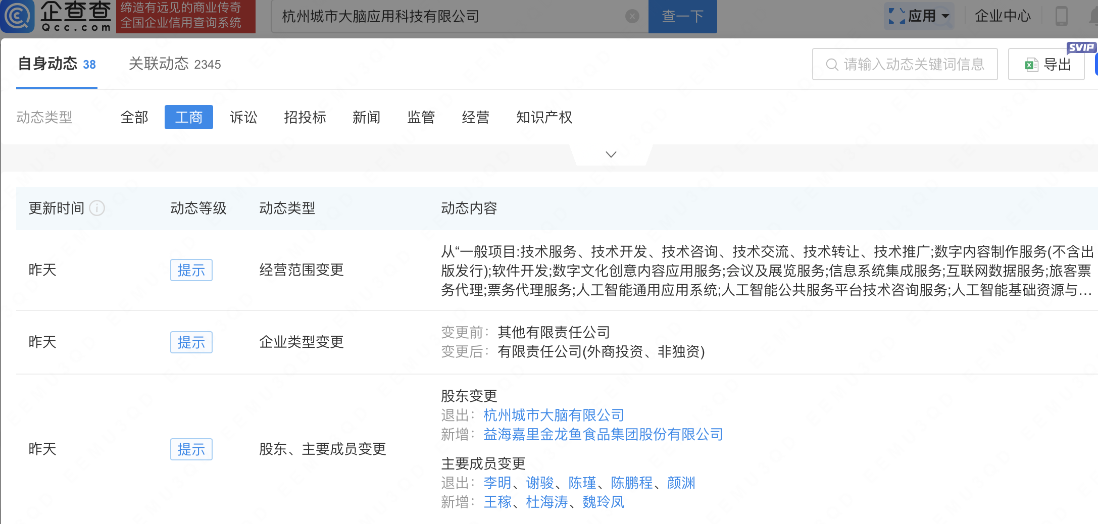 企查查APP显示,近日,杭州城市大脑应用科技有限公司发生工商变更,新增金龙鱼(300999)为股东。企查查信息显示,该公司成立于2020年,法定代表人为叶佩佩,经营范围包含:人工智能通用应用系统;人工智能公共服务平台技术咨询服务;人工智能基础资源与技术平台;人工智能公共数据平台等。