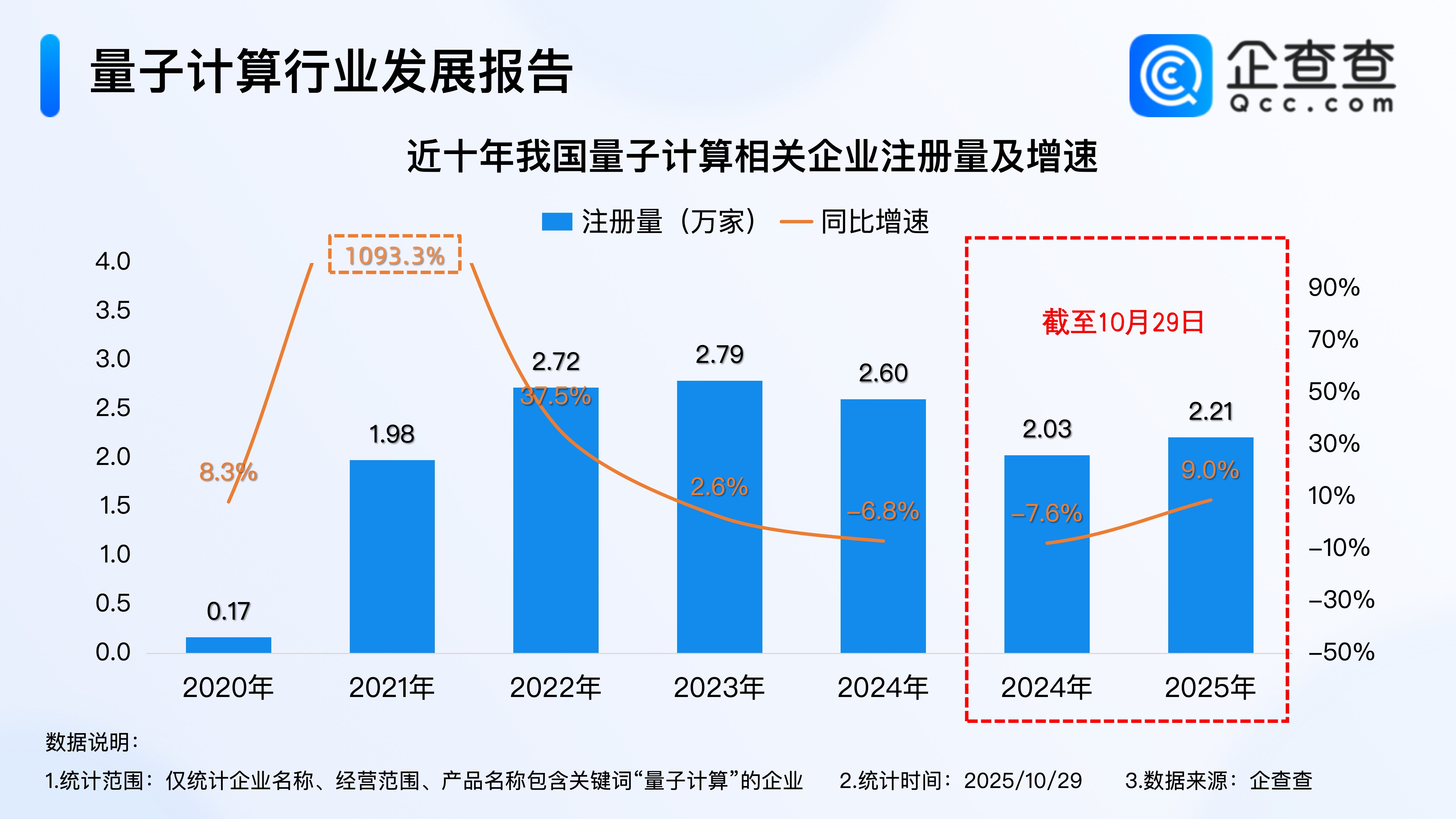 企查查数据显示,近年来,我国量子计算相关企业每年注册量基本呈现逐年增加的趋势,其中2021年全年注册量超2020年同期的10倍,达1.98万家,量子计算正式进入蓬勃发展阶段;截至10月29日,2025年我国已注册2.21万家量子计算相关企业,相比2024年同期增加9.0%,全年注册量有望再创新高。