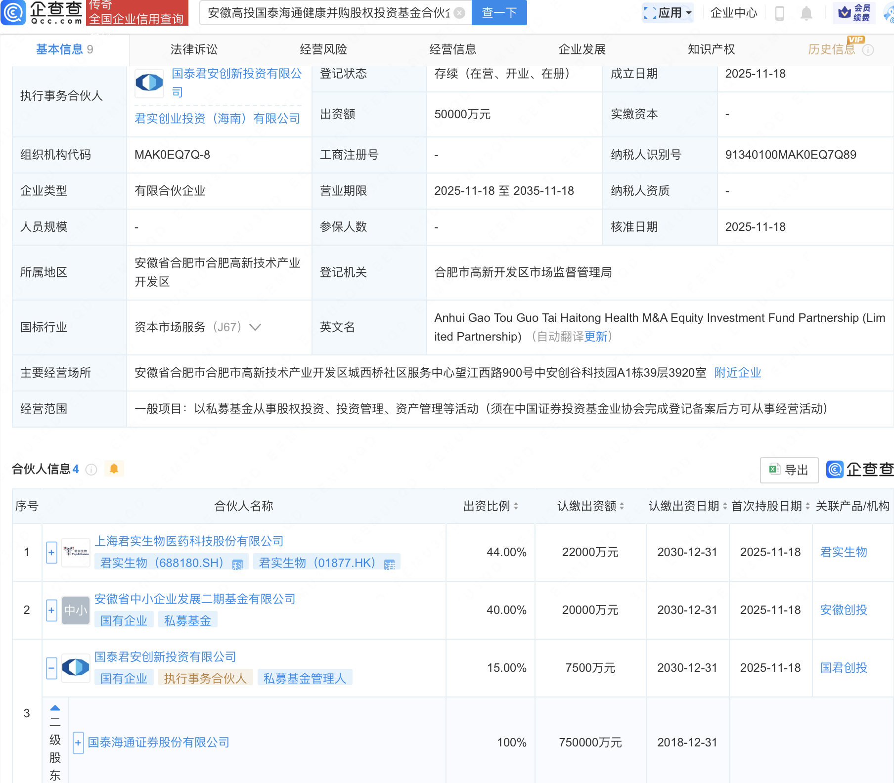 企查查APP显示,近日,安徽高投国泰海通健康并购股权投资基金合伙企业(有限合伙)成立,出资额5亿元,经营范围包含:以私募基金从事股权投资、投资管理、资产管理等活动。企查查股权穿透显示,该企业由君实生物(688180)、国泰海通(601211)全资子公司国泰君安创新投资有限公司等共同出资。