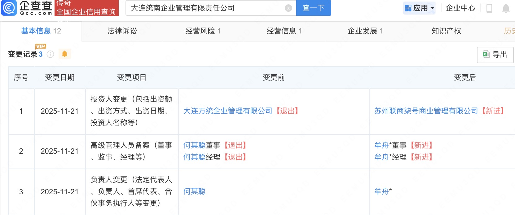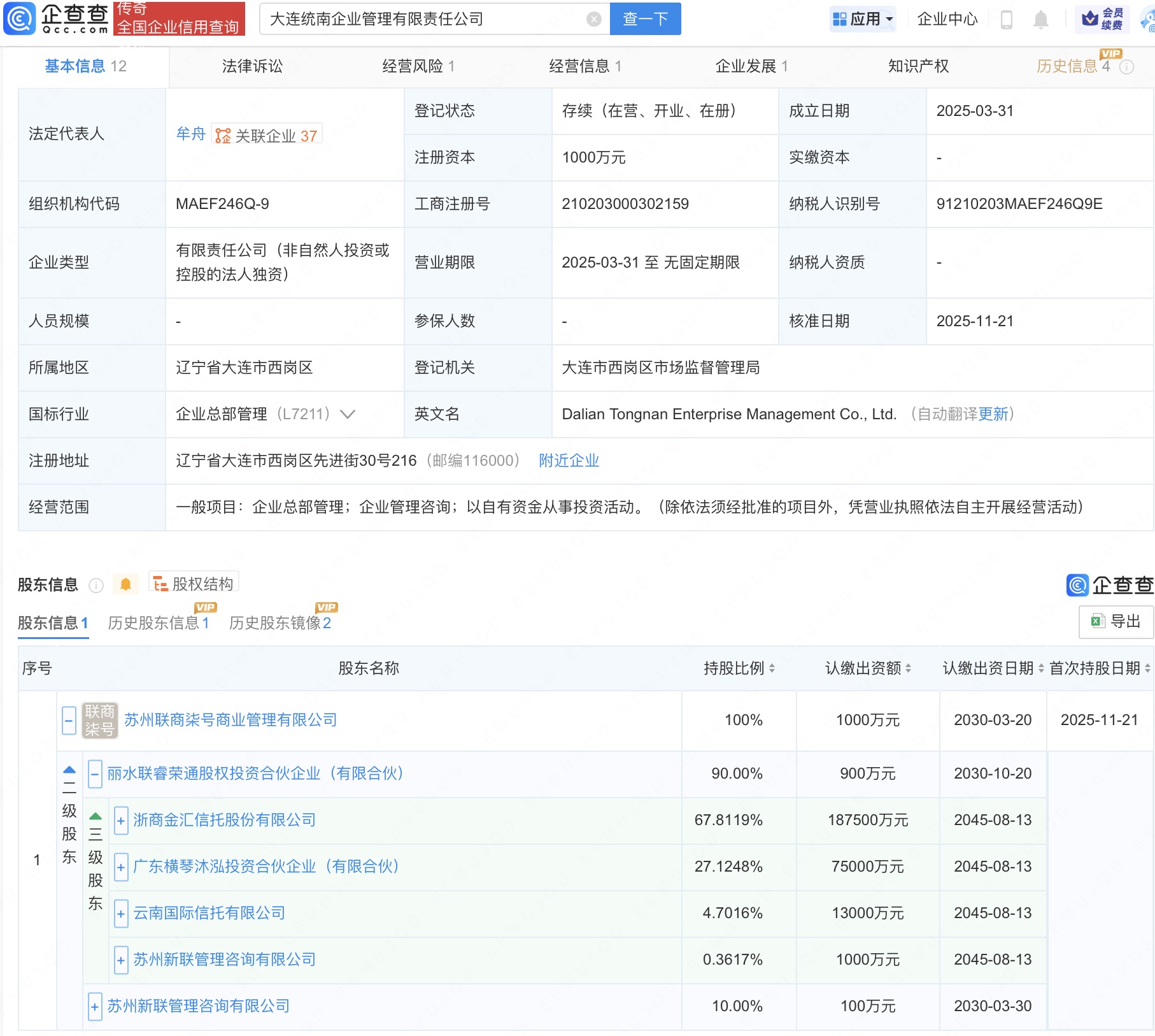 企查查信息显示,大连万颛企业管理有限公司、大连统南企业管理有限责任公司分别成立于今年1月、今年3月,法定代表人均为牟舟,注册资本均为1000万人民币,经营范围为企业总部管理、企业管理咨询、以自有资金从事投资活动。