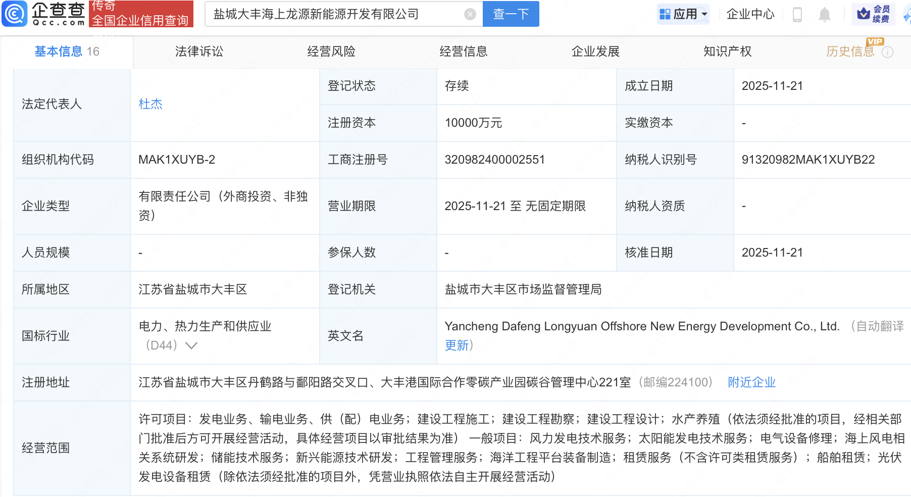 企查查APP显示,近日,盐城大丰海上龙源新能源开发有限公司成立,注册资本1亿元,经营范围包含:风力发电技术服务;太阳能发电技术服务;电气设备修理;海上风电相关系统研发等。企查查股权穿透显示,该公司由龙源电力(001289)、远景能源有限公司等共同持股。