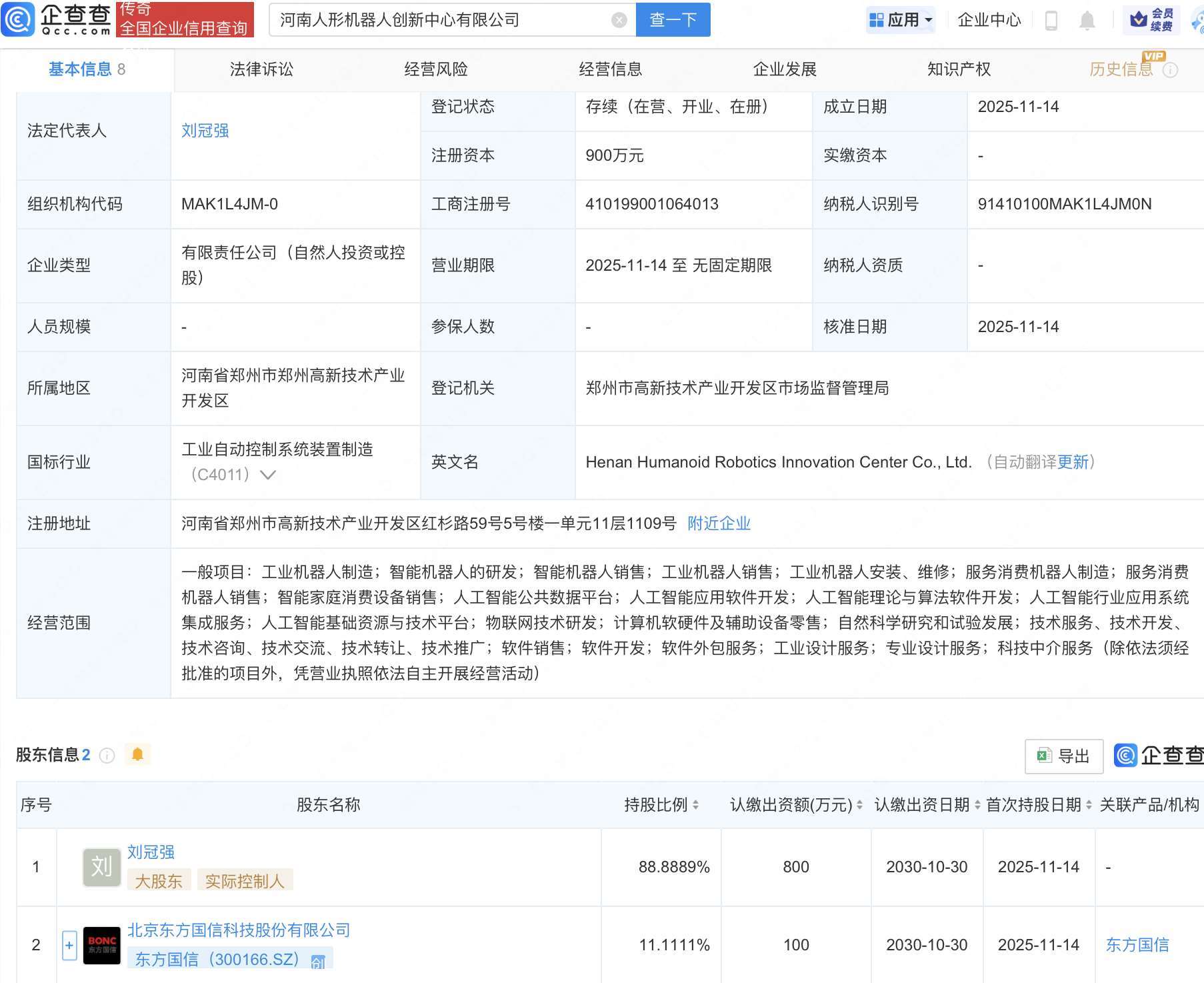 企查查APP显示,近日,河南人形机器人创新中心有限公司成立,经营范围包含:智能机器人的研发;智能机器人销售;人工智能公共数据平台;人工智能应用软件开发;人工智能理论与算法软件开发等。企查查股权穿透显示,该公司由东方国信(300166)等共同持股。