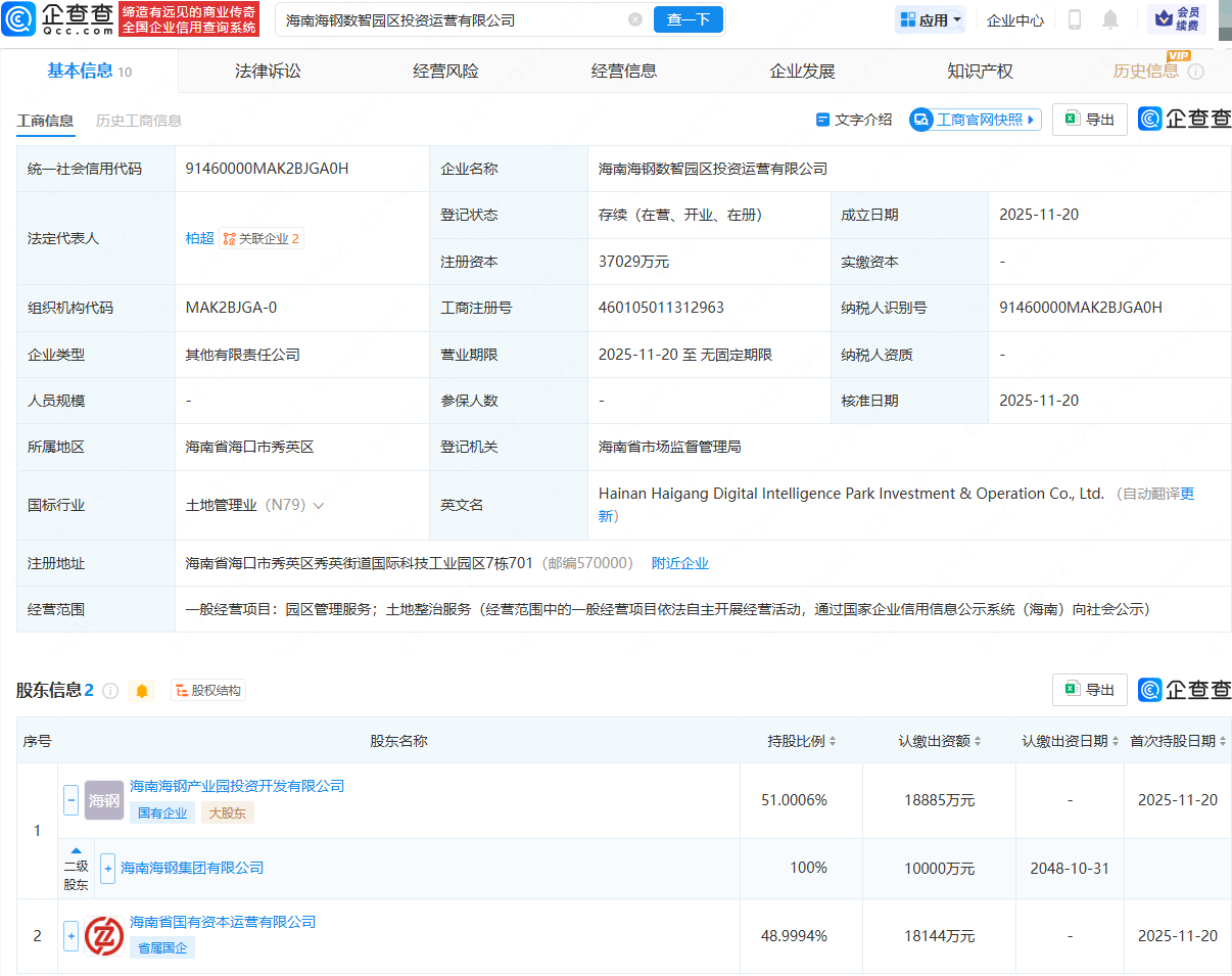 企查查APP显示,近日,海南海钢数智园区投资运营有限公司成立,法定代表人为柏超,注册资本约为3.7亿元,经营范围包含:园区管理服务;土地整治服务。企查查股权穿透显示,该公司由海南海钢集团有限公司旗下海南海钢产业园投资开发有限公司、海南省国有资本运营有限公司共同持股。