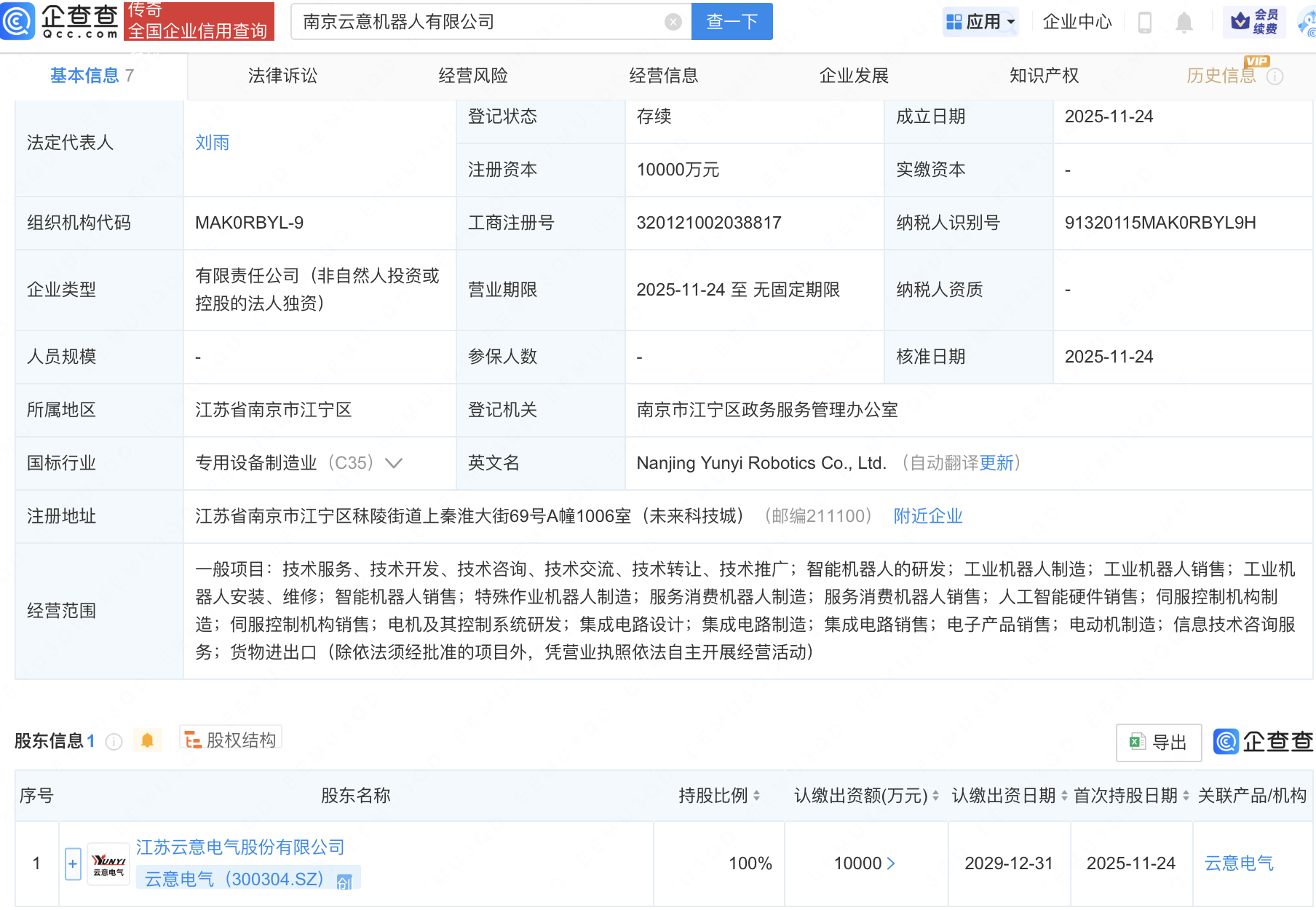 企查查APP显示,近日,南京云意机器人有限公司成立,注册资本1亿元,经营范围包含:智能机器人的研发;人工智能硬件销售;集成电路设计;集成电路制造等。企查查股权穿透显示,该公司由云意电气(300304)全资持股。