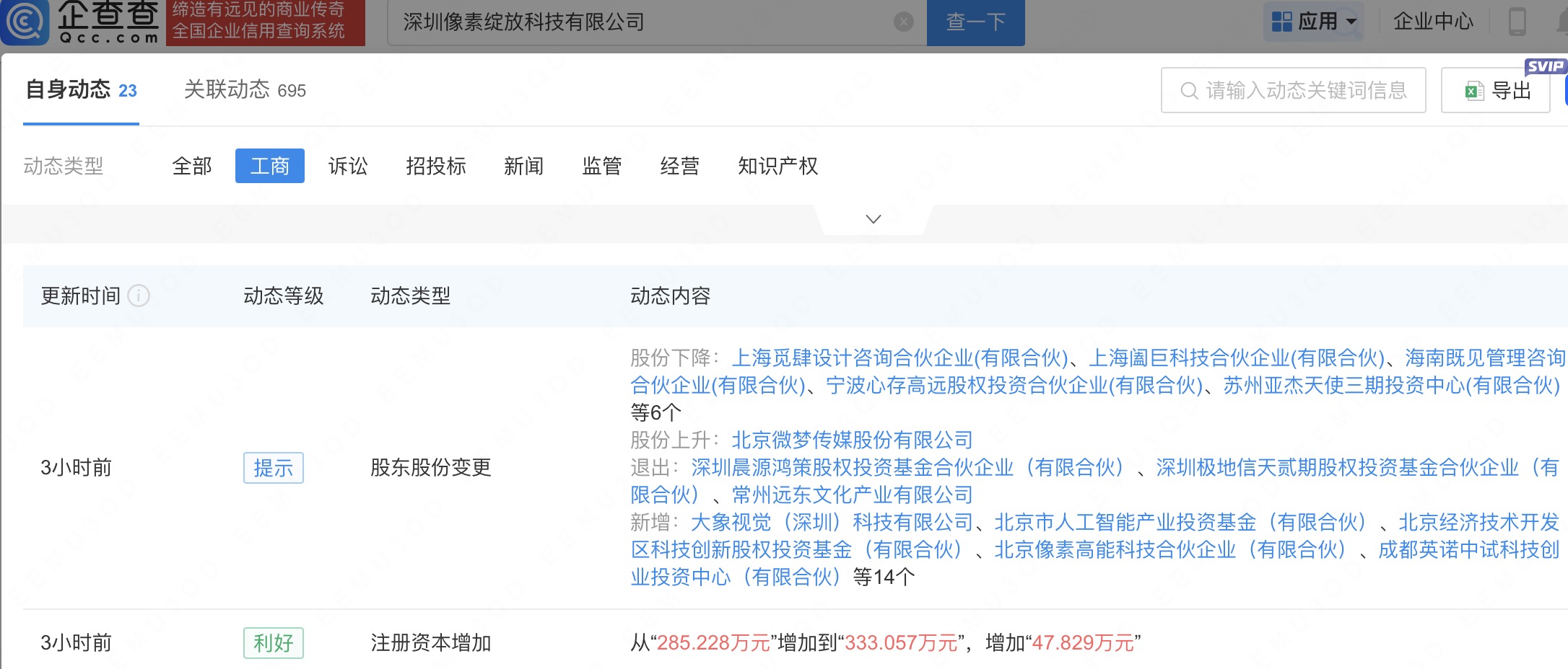 企查查APP显示,近日,深圳像素绽放科技有限公司发生工商变更,新增北京市人工智能产业投资基金(有限合伙)等为股东,同时注册资本增至333.057万元。企查查信息显示,该公司成立于2021年,经营范围包含:人工智能应用软件开发;数据处理服务;图文设计制作等。公开信息显示,像素绽放是一家AI办公工具研发商。
