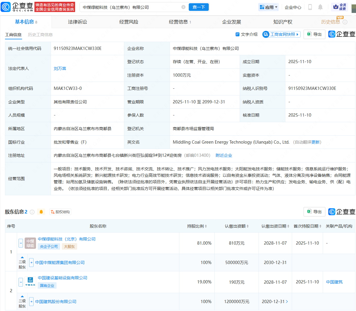企查查APP显示,近日,中煤绿能科技(乌兰察布)有限公司成立,法定代表人为刘万喜,注册资本为1000万元,经营范围包含:风力发电技术服务;太阳能发电技术服务;储能技术服务;站用加氢及储氢设施销售等。企查查股权穿透显示,该公司由中国中煤能源集团有限公司旗下中煤绿能科技(北京)有限公司、中国建筑(601668)旗下中国建设基础设施有限公司共同持股。