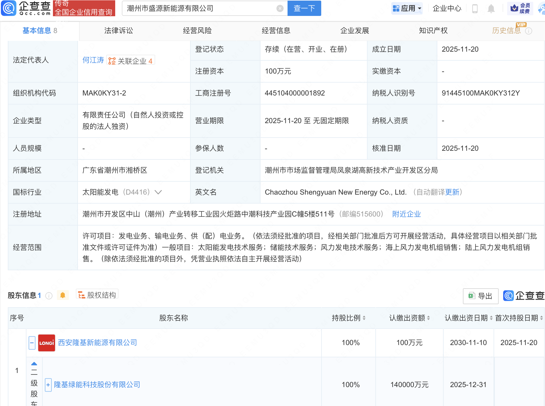 企查查APP显示,近日,潮州市盛源新能源有限公司成立,经营范围包含:太阳能发电技术服务;储能技术服务;风力发电技术服务;海上风力发电机组销售等。企查查股权穿透显示,该公司由隆基绿能(601012)间接全资持股。