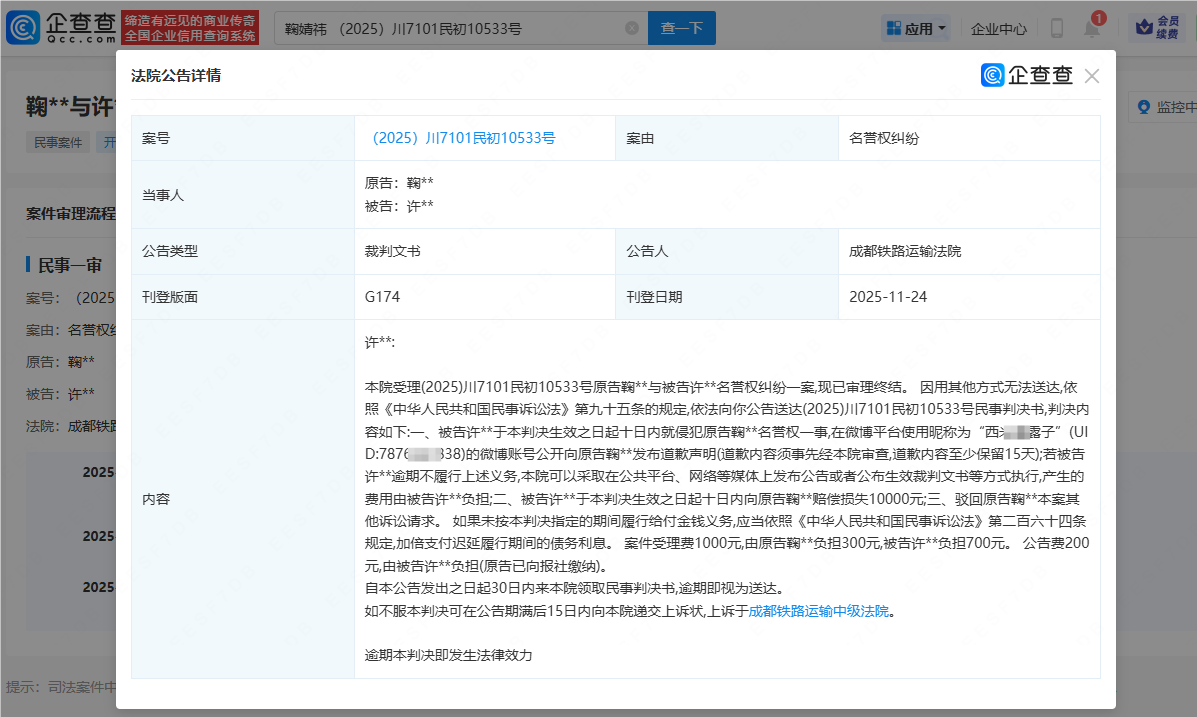 企查查APP显示,近日,法院刊登鞠婧祎起诉许某某名誉权纠纷一案民事判决书。公告显示,法院判决许某某通过涉案账号公开向鞠婧祎发布道歉声明,并赔偿损失10000元。