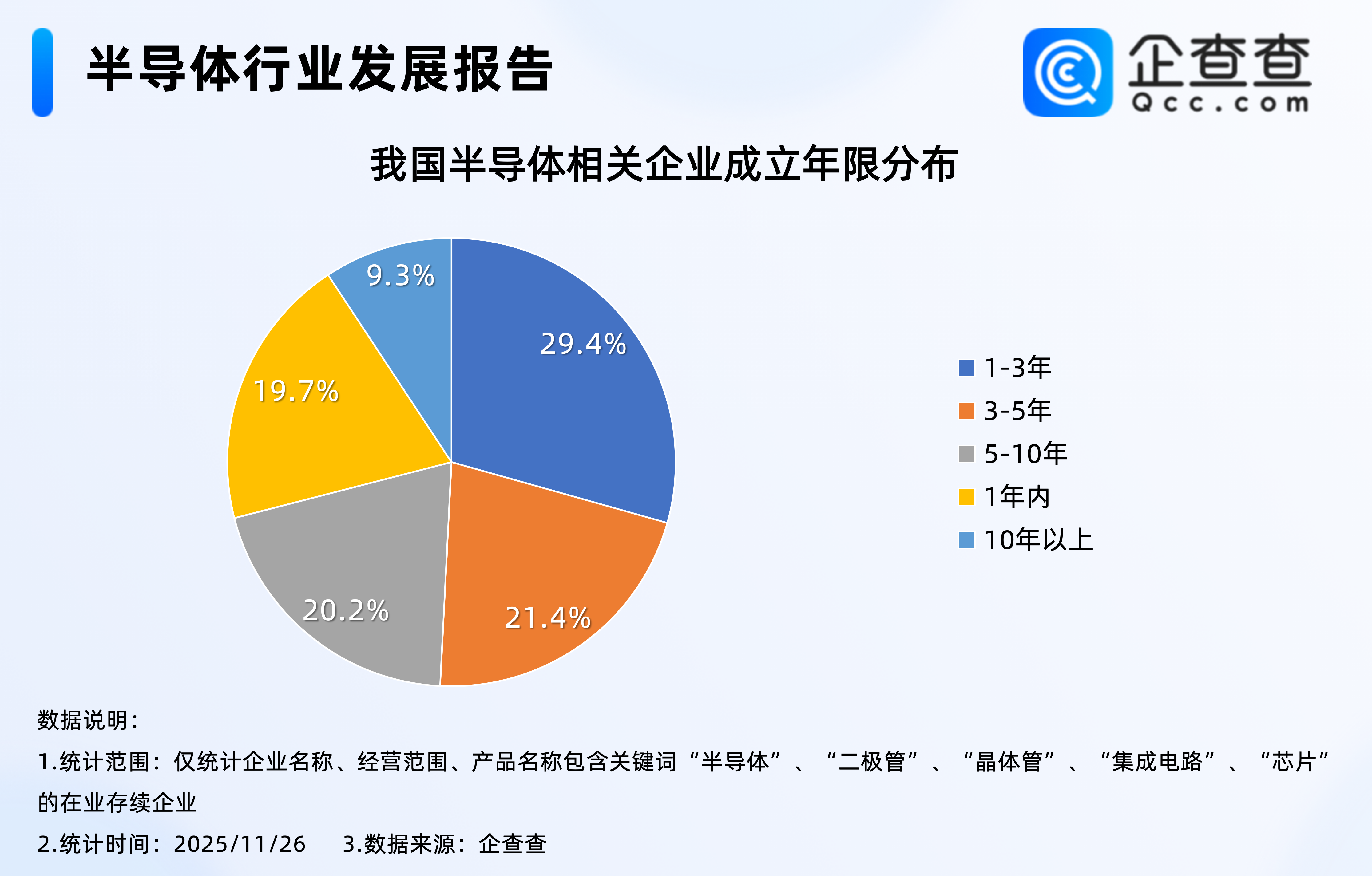 企查查数据显示,截至11月26日,我国现存超110万家半导体相关企业,成立年限上,我国近三成半导体相关企业成立年限在1至3年之间,占比达29.4%,其次是成立年限在3至5年之间的企业,占比21.4%。