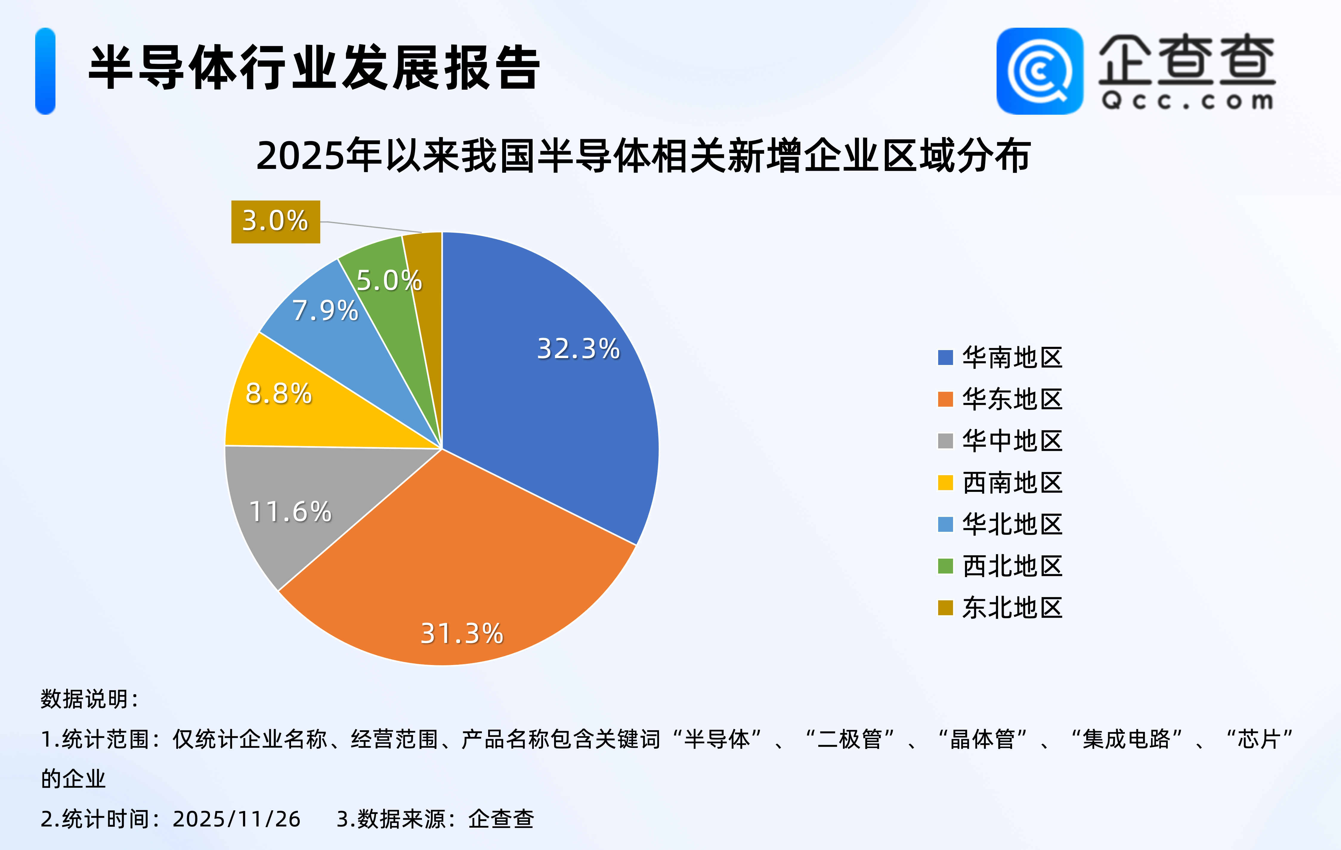 企查查数据显示,2025年以来注册的20.1万家半导体相关企业中,分布在华南地区的相关企业最多,占比32.3%,其次是华东地区,占比31.3%,西北、东北地区相对最少,分别占比5.0%、3.0%。