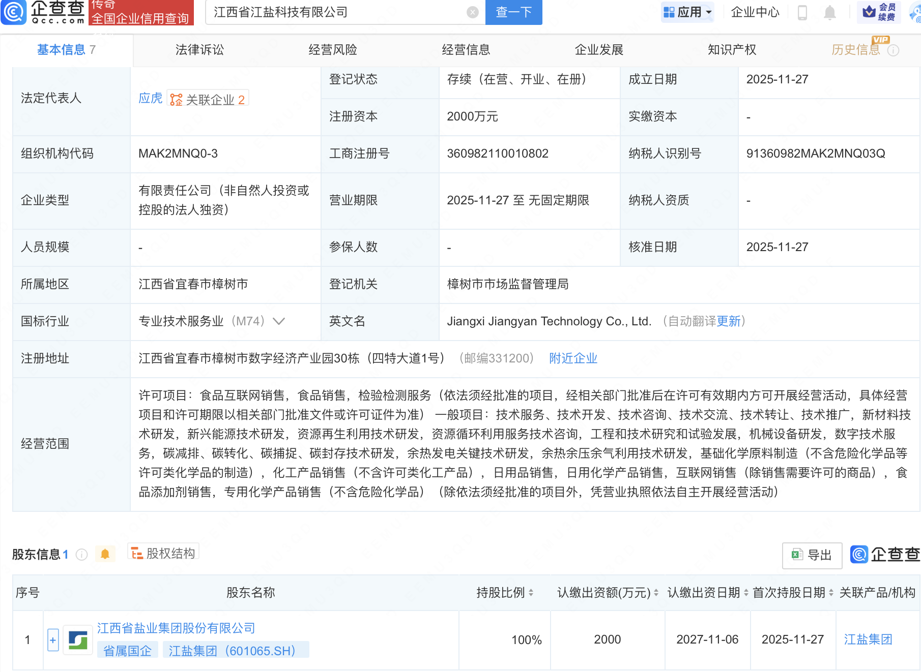 企查查APP显示,近日,江西省江盐科技有限公司成立,注册资本2000万元,经营范围包含:数字技术服务,碳减排、碳转化、碳捕捉、碳封存技术研发,余热发电关键技术研发,余热余压余气利用技术研发等。企查查股权穿透显示,该公司由江盐集团(601065)全资持股。