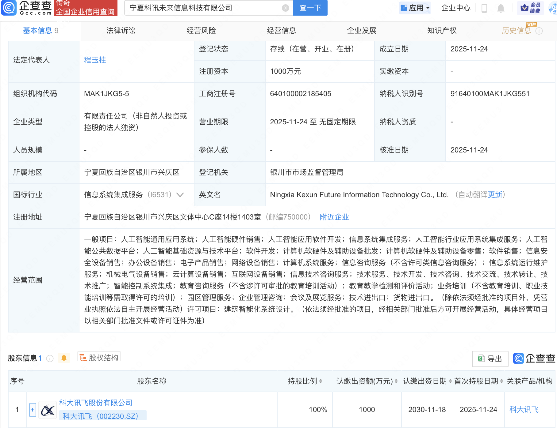 企查查APP显示,近日,宁夏科讯未来信息科技有限公司成立,注册资本1000万元,经营范围包含:人工智能通用应用系统;人工智能硬件销售;人工智能应用软件开发;信息系统集成服务;人工智能行业应用系统集成服务等。企查查股权穿透显示,该公司由科大讯飞(002230)全资持股。