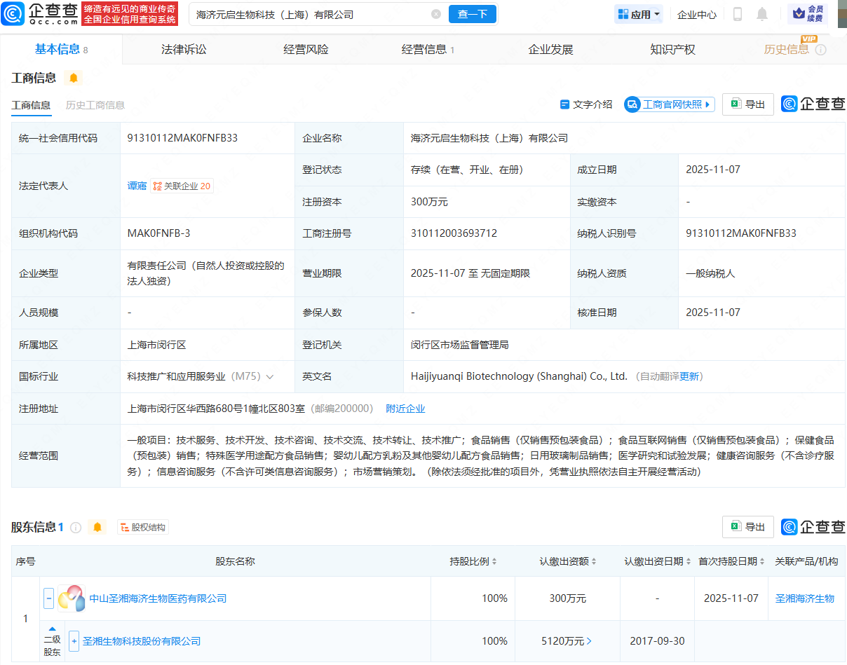 企查查APP显示,近日,海济元启生物科技(上海)有限公司成立,法定代表人为谭寤,经营范围包含:食品销售(仅销售预包装食品);保健食品(预包装)销售;医学研究和试验发展等。企查查股权穿透显示,该公司由圣湘生物(688289)间接全资持股。
