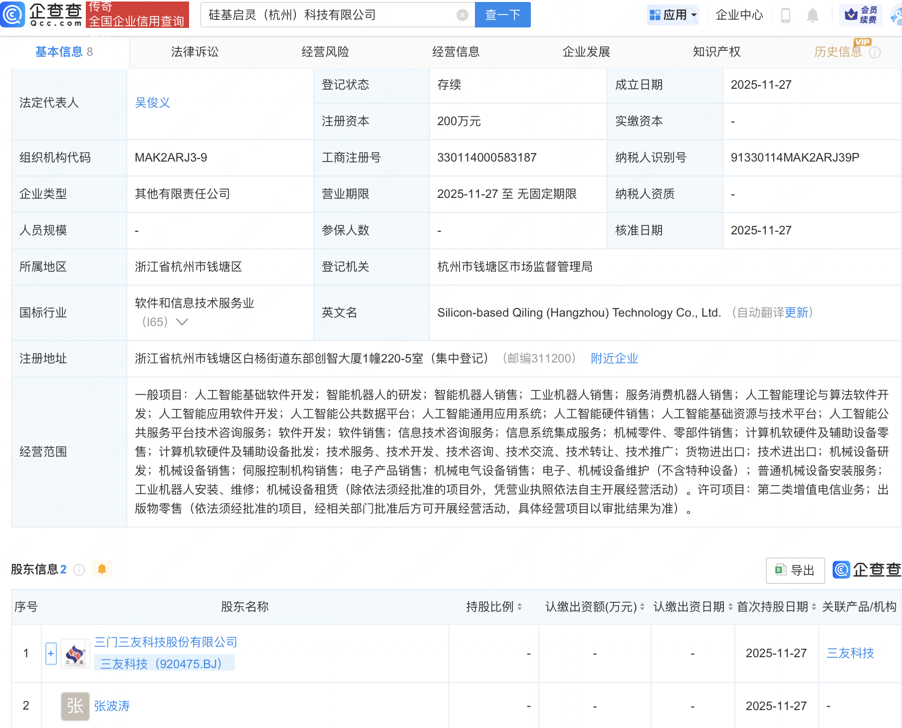 企查查APP显示,近日,硅基启灵(杭州)科技有限公司成立,经营范围包含:人工智能基础软件开发;智能机器人的研发;智能机器人销售;人工智能理论与算法软件开发等。企查查股权穿透显示,该公司由三友科技(920475)等共同持股。