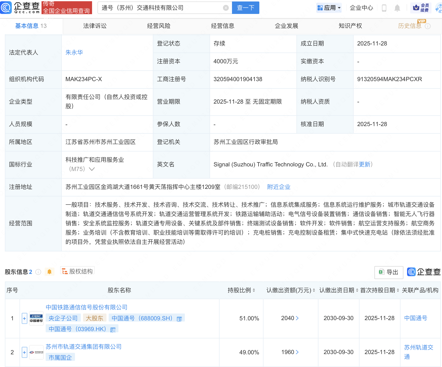 企查查APP显示,近日,通号(苏州)交通科技有限公司成立,注册资本4000万元,经营范围包含:轨道交通运营管理系统开发;铁路运输辅助活动;电气信号设备装置销售;智能无人飞行器销售等。企查查股权穿透显示,该公司由中国通号(688009)等共同持股。