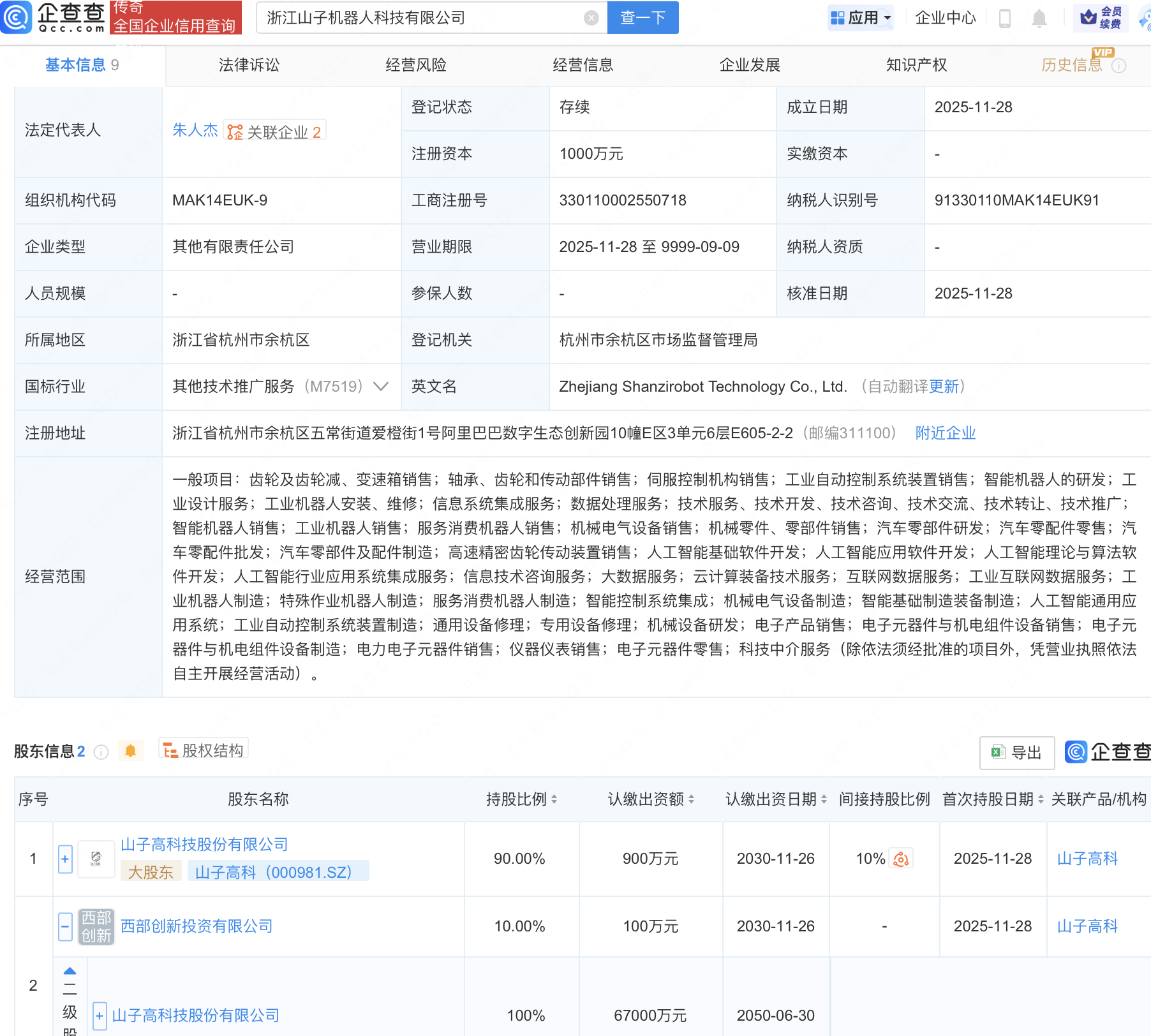 企查查APP显示,近日,浙江山子机器人科技有限公司成立,注册资本1000万元,经营范围包含:智能机器人的研发;人工智能基础软件开发;人工智能应用软件开发;人工智能理论与算法软件开发等。企查查股权穿透显示,该公司由山子高科(000981)间接全资持股。
