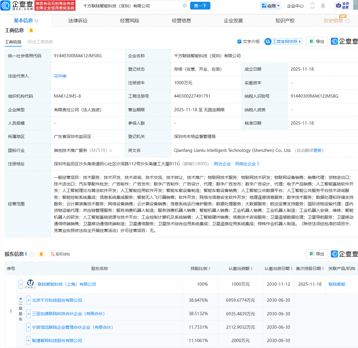企查查APP显示,近日,千方联陆智能科技(深圳)有限公司成立,法定代表人为花中南,注册资本为1000万元,经营范围包含:物联网技术服务;人工智能基础软件开发;卫星移动通信终端制造;卫星通信服务等。企查查股权穿透显示,该公司由联陆智能科技(上海)有限公司全资持股,后者由千方科技(002373)、联通智网科技股份有限公司等共同持股。