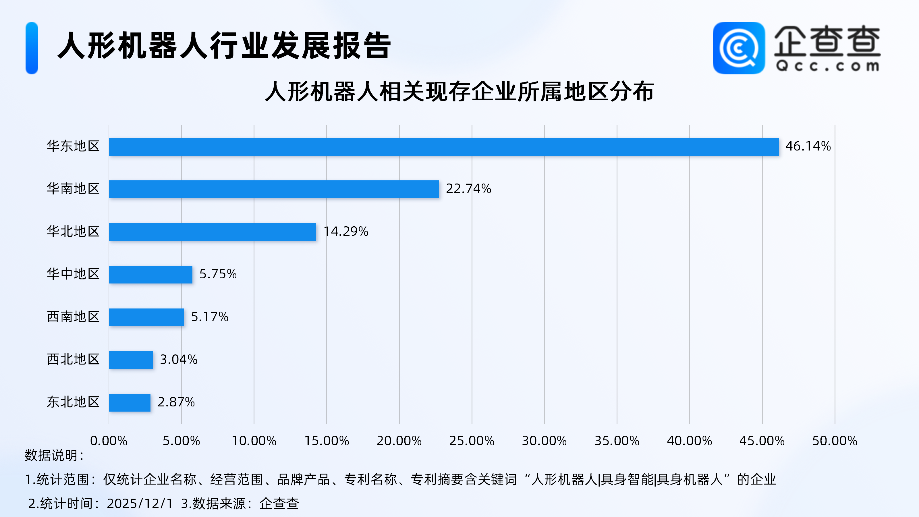 企查查数据显示,截至12月1日,国内人形机器人相关企业现存量达1218家,主要分布在华东地区,占比达46.14%,其次为华南地区,占比达22.74%。分布在华北地区的相关企业占比达14.29%,其余地区的占比均不足10%。