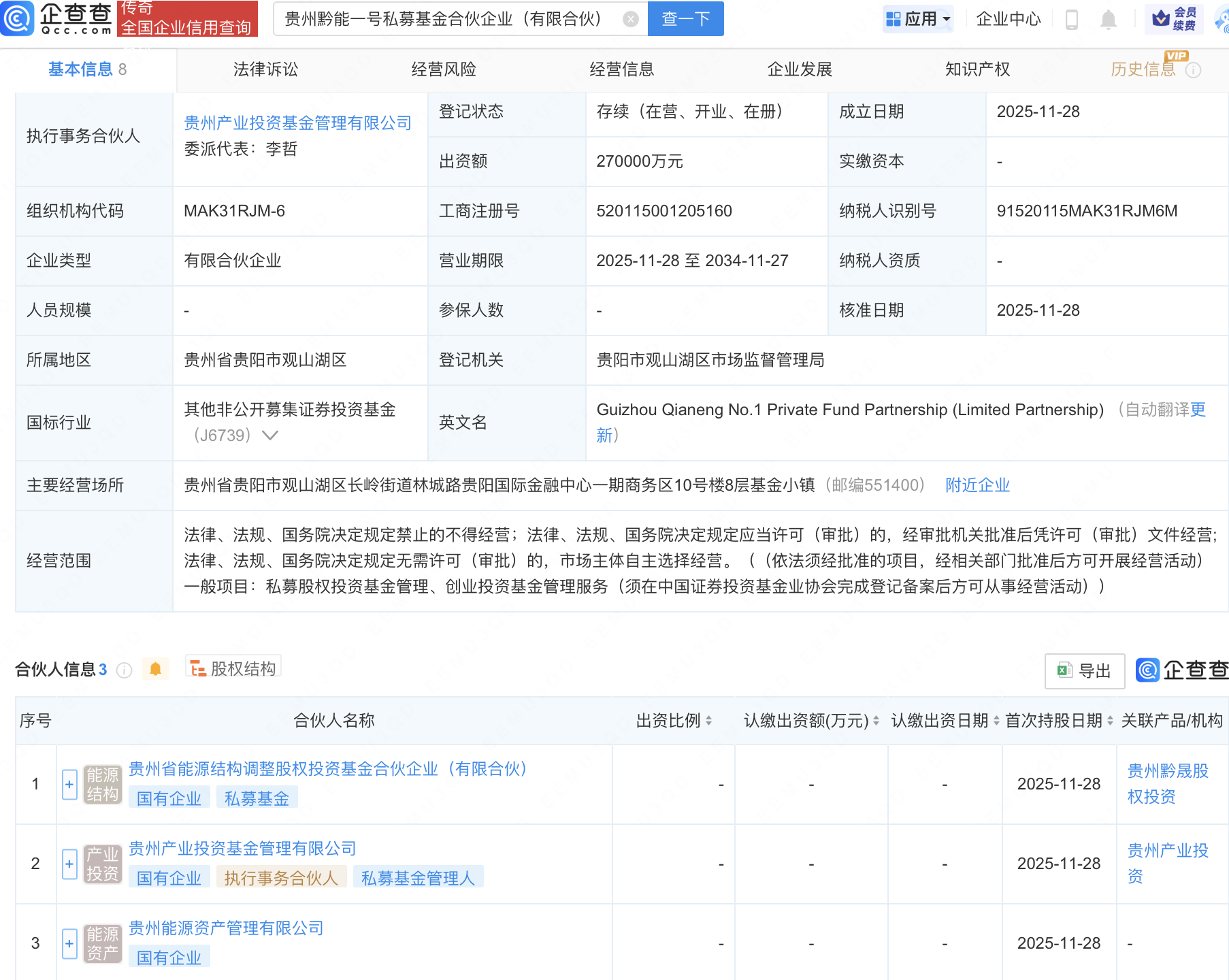 企查查APP显示,近日,贵州黔能一号私募基金合伙企业(有限合伙)成立,出资额27亿元,经营范围包含:私募股权投资基金管理、创业投资基金管理服务。企查查股权穿透显示,该企业由贵州省能源结构调整股权投资基金合伙企业(有限合伙)、贵州产业投资基金管理有限公司等共同出资。