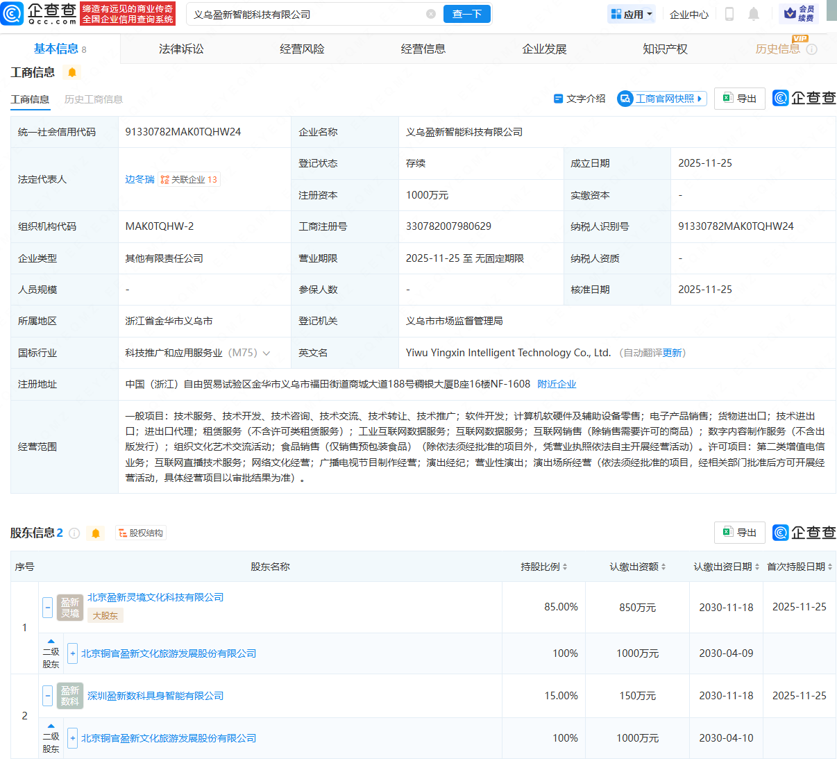 企查查APP显示,近日,义乌盈新智能科技有限公司成立,法定代表人为边冬瑞,注册资本为1000万元,经营范围包含:软件开发;计算机软硬件及辅助设备零售;电子产品销售;互联网直播技术服务;网络文化经营等。企查查股权穿透显示,该公司由盈新发展(000620)间接全资持股。
