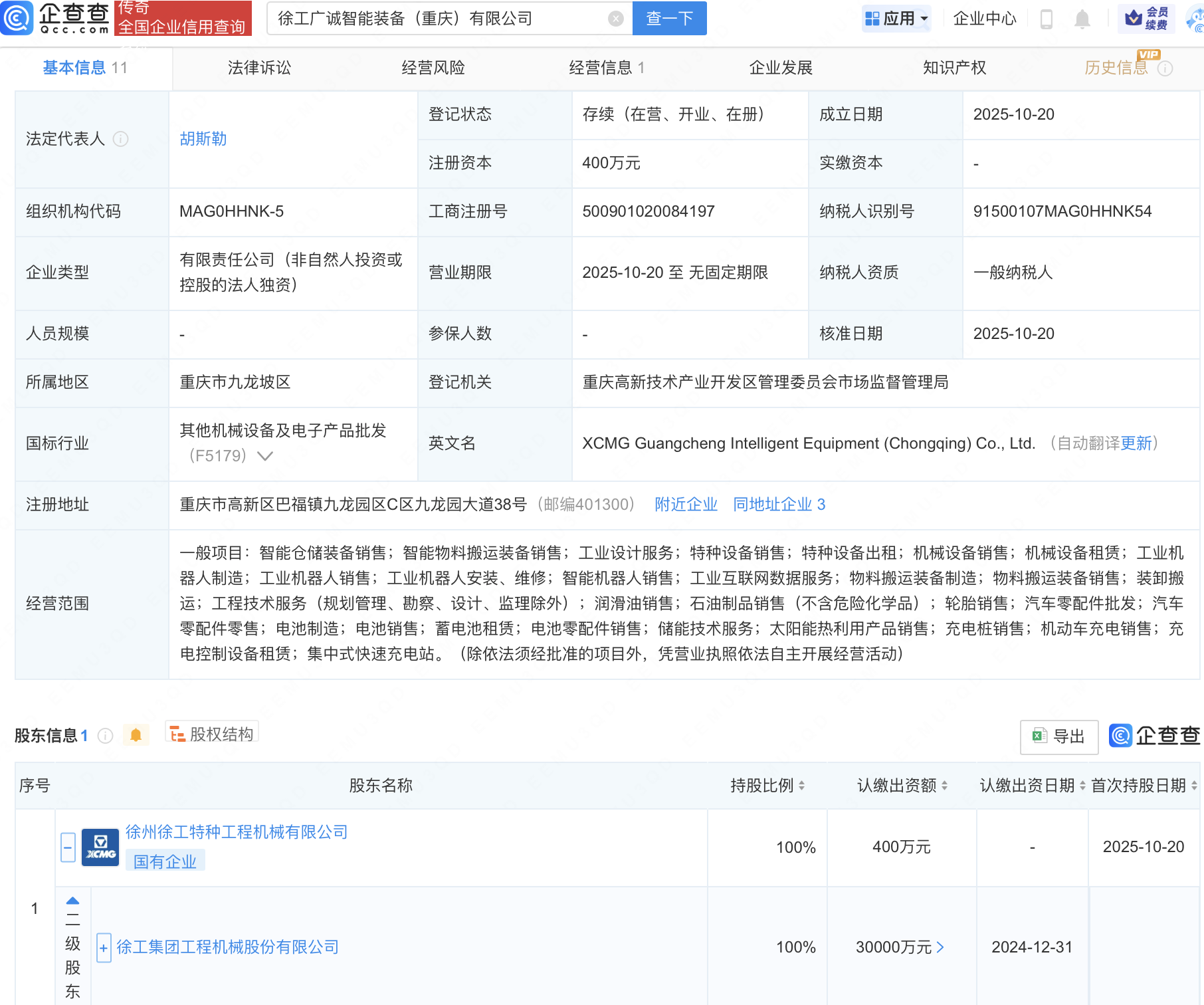 企查查APP显示,徐工广诚智能装备(重庆)有限公司成立,经营范围包含:智能机器人销售;工业互联网数据服务;充电桩销售;机动车充电销售;充电控制设备租赁等。企查查股权穿透显示,该公司由徐工机械(000425)间接全资持股。
