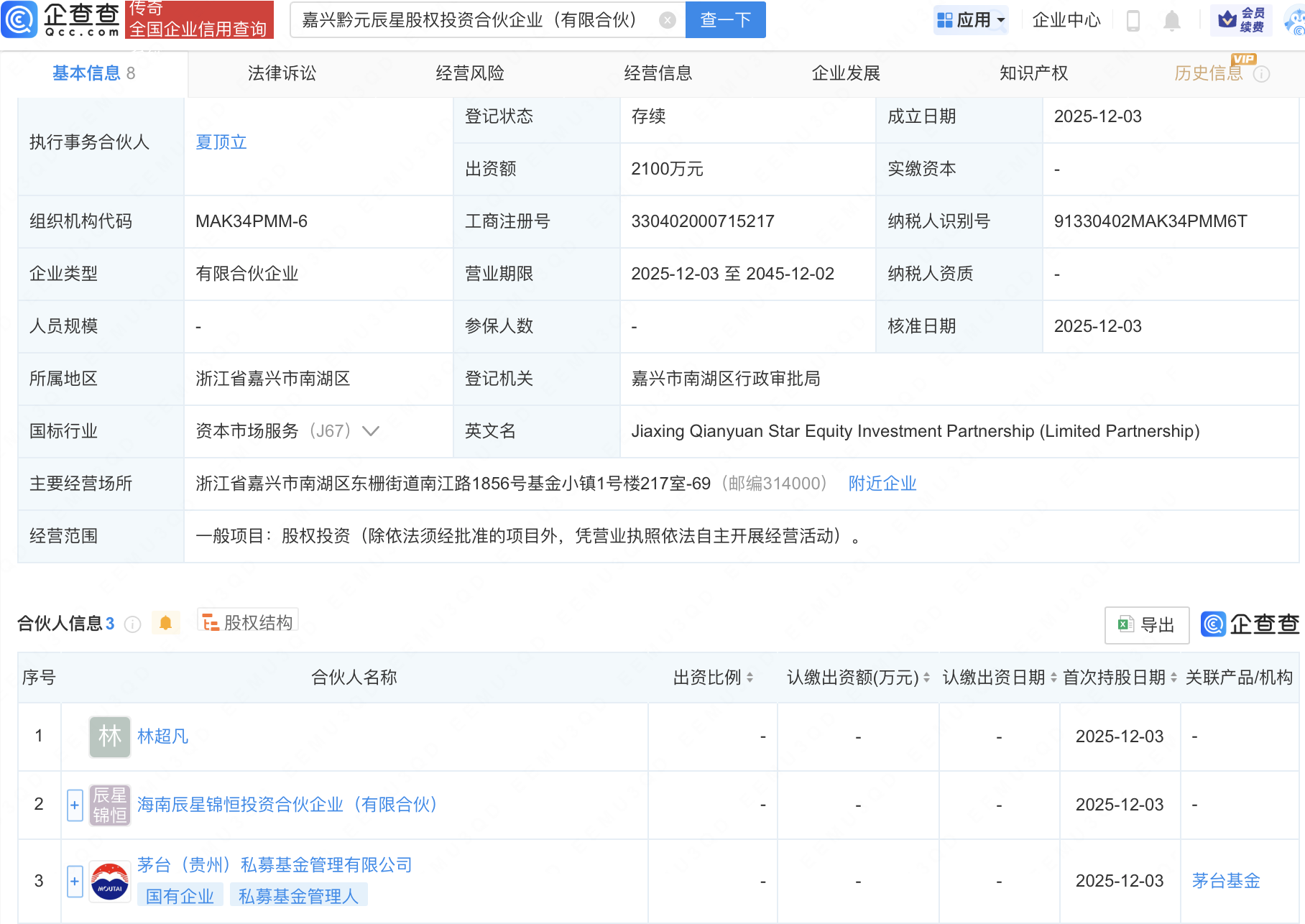 企查查APP显示,近日,嘉兴黔元辰星股权投资合伙企业(有限合伙)成立,出资额2100万元,经营范围包含股权投资。企查查股权穿透显示,该企业由茅台(贵州)私募基金管理有限公司等共同出资。