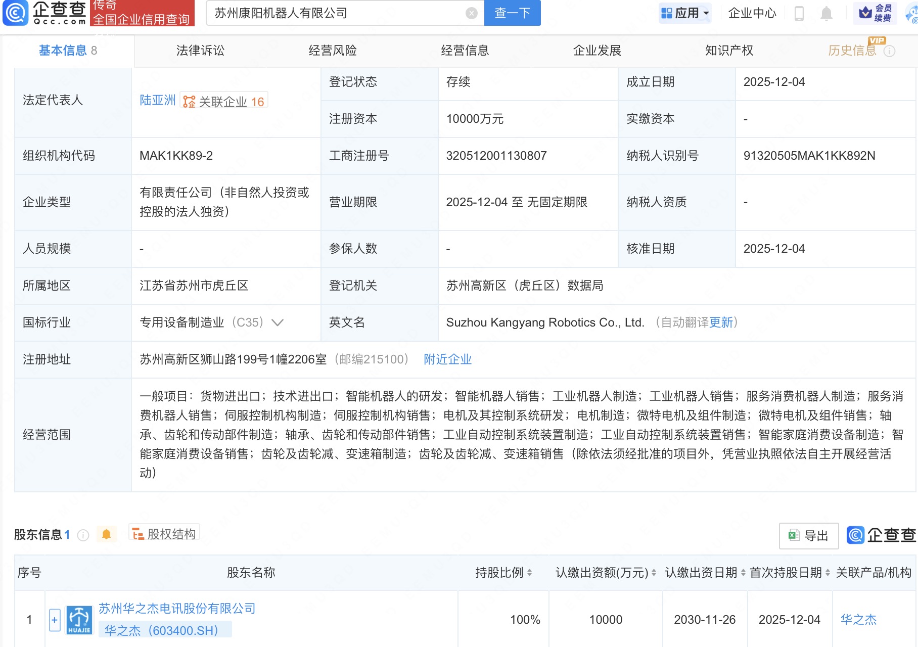 企查查APP显示,近日,苏州康阳机器人有限公司成立,法定代表人为陆亚洲,注册资本1亿人民币,经营范围包括智能机器人的研发、智能机器人销售、服务消费机器人制造、电机及其控制系统研发等。企查查股权穿透显示,该公司由华之杰(603400)全资持股。