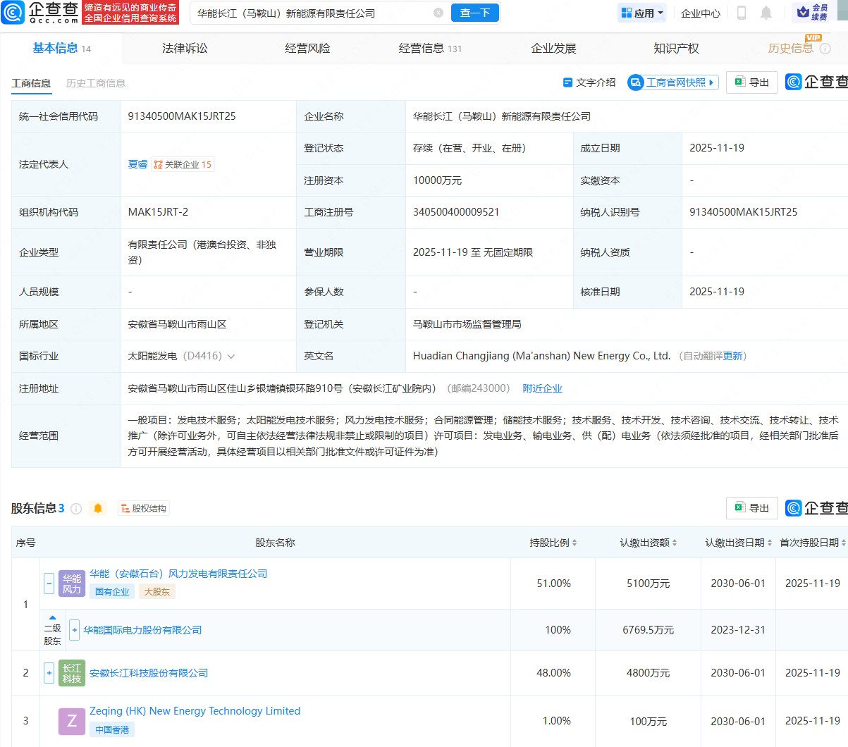 企查查APP显示,近日,华能长江(马鞍山)新能源有限责任公司成立,法定代表人为夏睿,注册资本为1亿元,经营范围包含:发电技术服务;太阳能发电技术服务;风力发电技术服务;合同能源管理;储能技术服务等。企查查股权穿透显示,该公司由华能国际(600011)全资子公司华能(安徽石台)风力发电有限责任公司、安徽长江科技股份有限公司等共同持股。