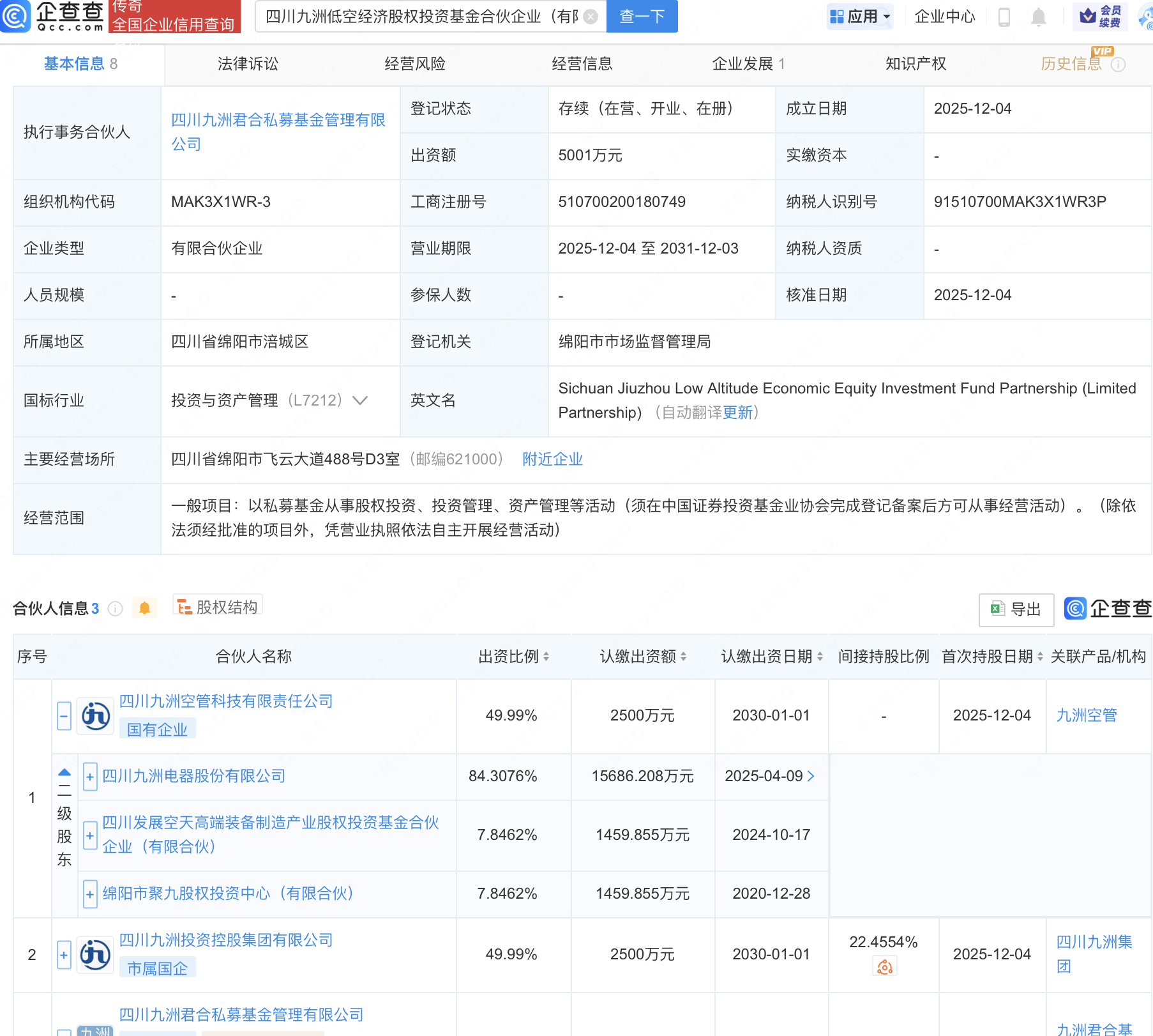 企查查APP显示,近日,四川九洲低空经济股权投资基金合伙企业(有限合伙)成立,经营范围包含:以私募基金从事股权投资、投资管理、资产管理等活动。企查查股权穿透显示,该企业由四川九洲(000801)旗下四川九洲空管科技有限责任公司等共同出资。