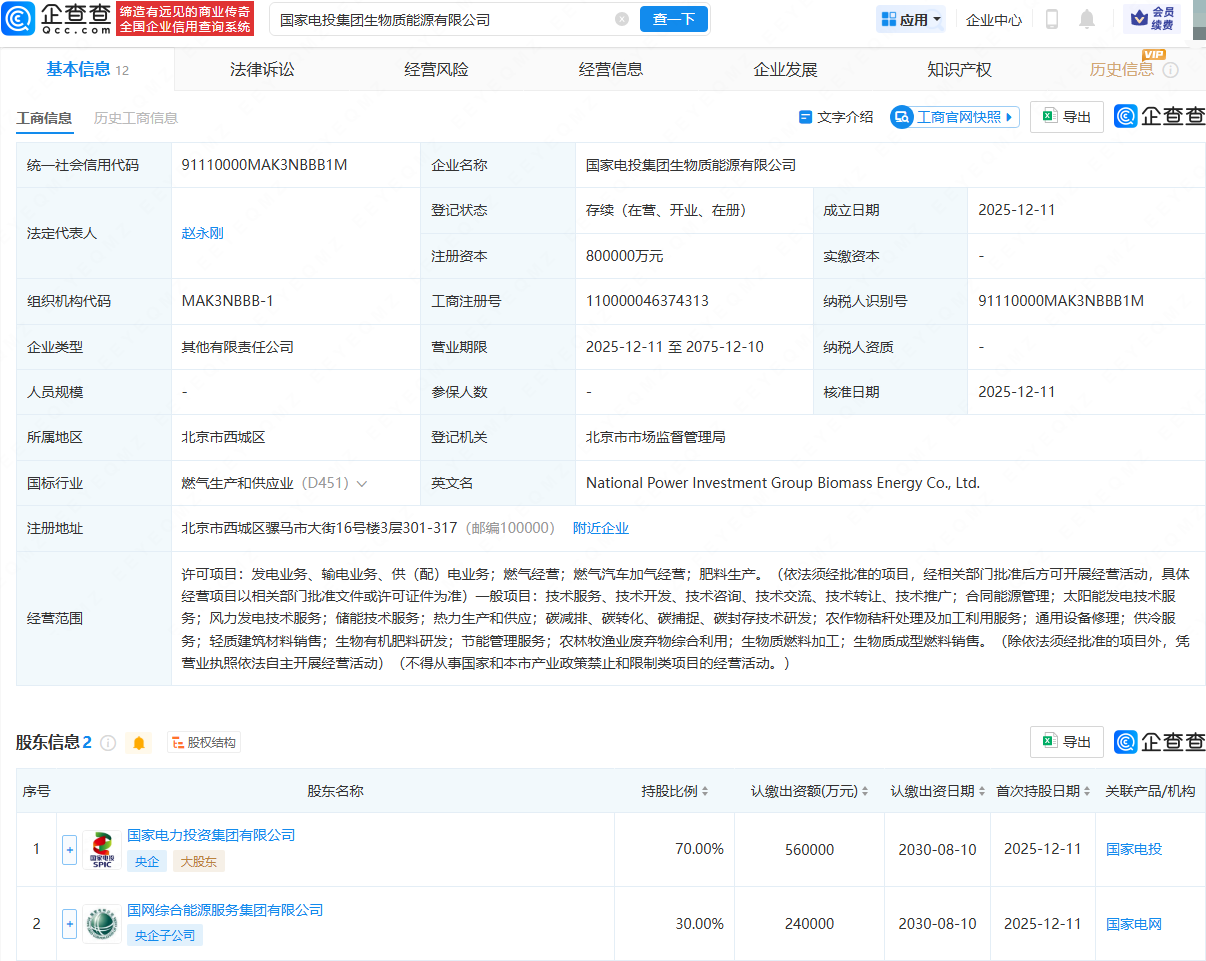 企查查APP显示,近日,国家电投集团生物质能源有限公司成立,法定代表人为赵永刚,注册资本为80亿元,经营范围包含:发电业务、输电业务、供(配)电业务;燃气经营;燃气汽车加气经营;肥料生产;储能技术服务等。企查查股权穿透显示,该公司由国家电力投资集团有限公司、国网综合能源服务集团有限公司共同持股。