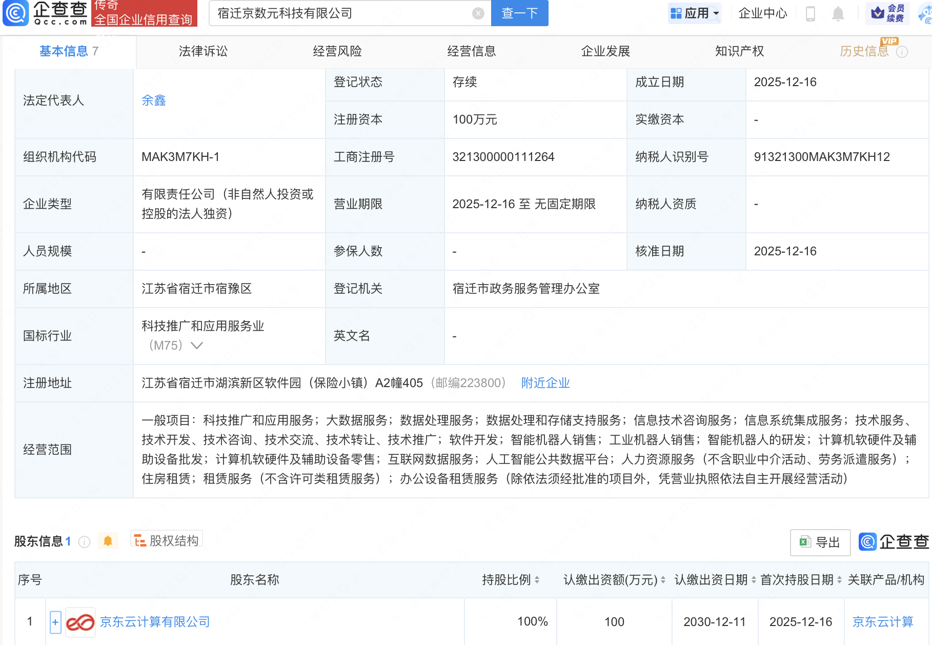 企查查APP显示,近日,宿迁京数元科技有限公司成立,经营范围包含:智能机器人销售;工业机器人销售;智能机器人的研发;互联网数据服务;人工智能公共数据平台等。企查查股权穿透显示,该公司由京东云计算有限公司全资持股。