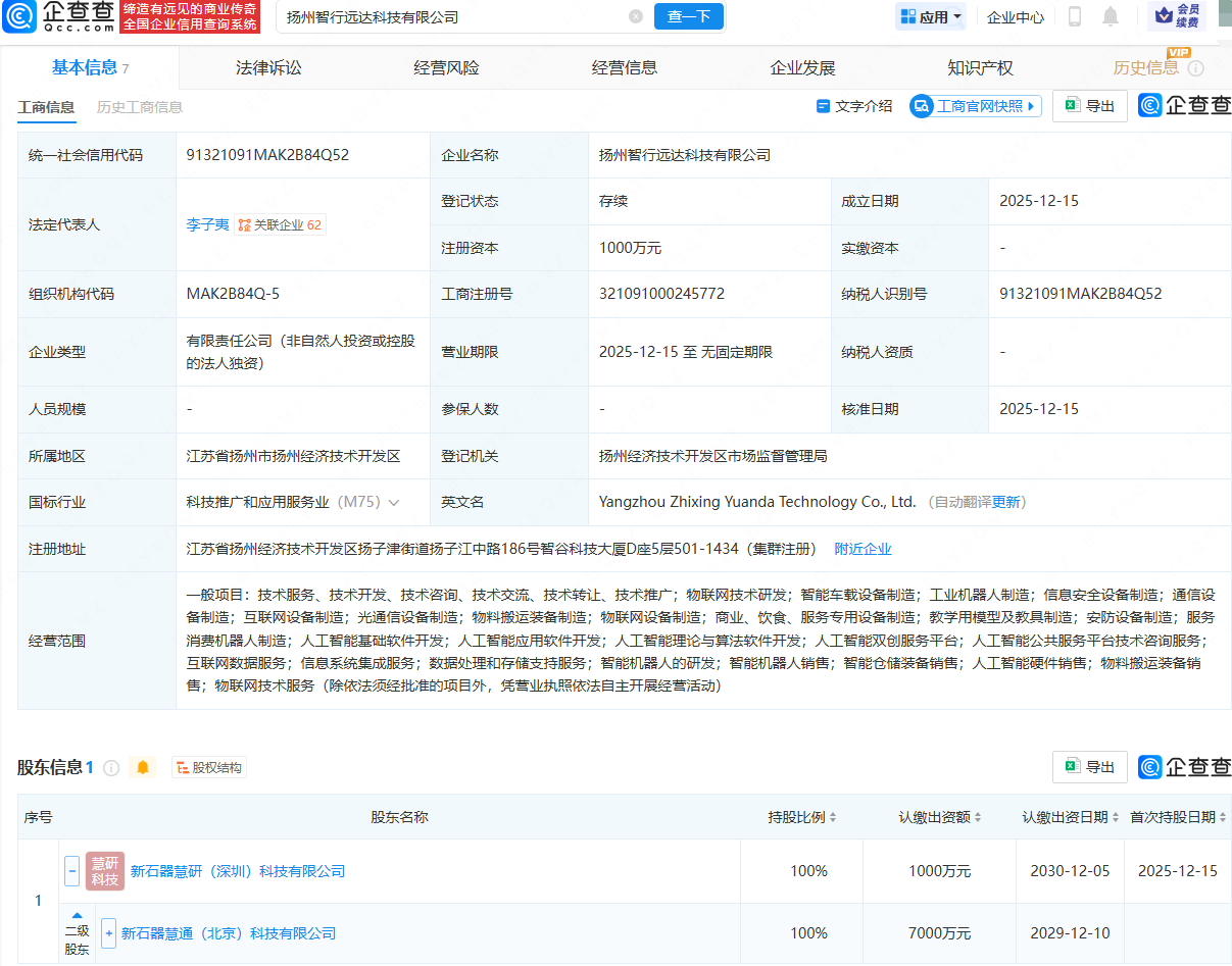 企查查APP显示,近日,扬州智行远达科技有限公司成立,法定代表人为李子夷,注册资本为1000万元,经营范围包含:物联网技术研发;智能车载设备制造;工业机器人制造;人工智能基础软件开发;人工智能应用软件开发等。企查查股权穿透显示,该公司由新石器慧通(北京)科技有限公司间接全资持股。