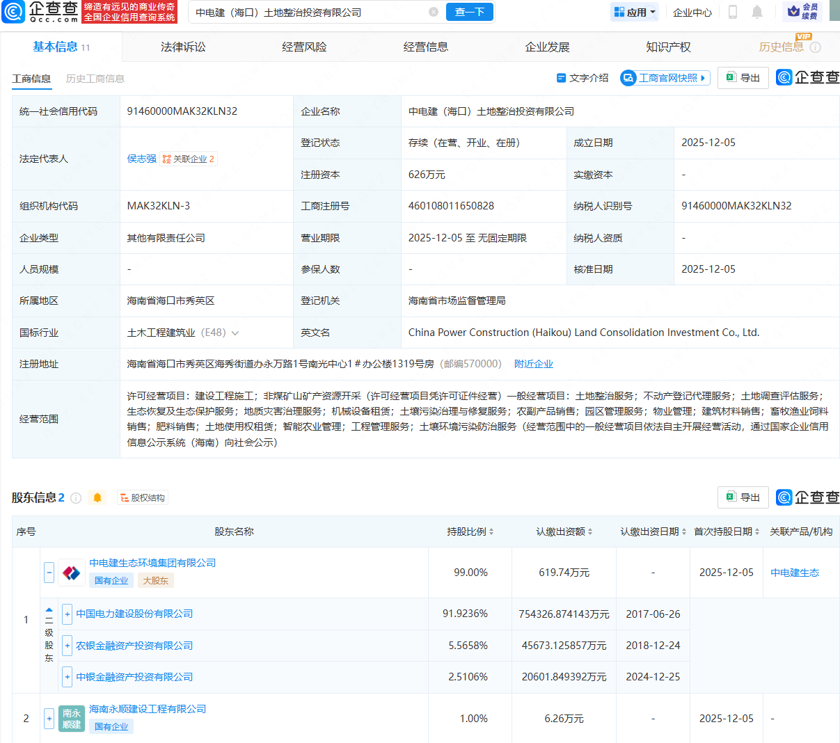 企查查APP显示,近日,中电建(海口)土地整治投资有限公司成立,法定代表人为侯志强,经营范围包含:建设工程施工;非煤矿山矿产资源开采;土地整治服务;不动产登记代理服务;生态恢复及生态保护服务等。企查查股权穿透显示,该公司由中国电建(601669)旗下中电建生态环境集团有限公司、海南永顺建设工程有限公司共同持股。
