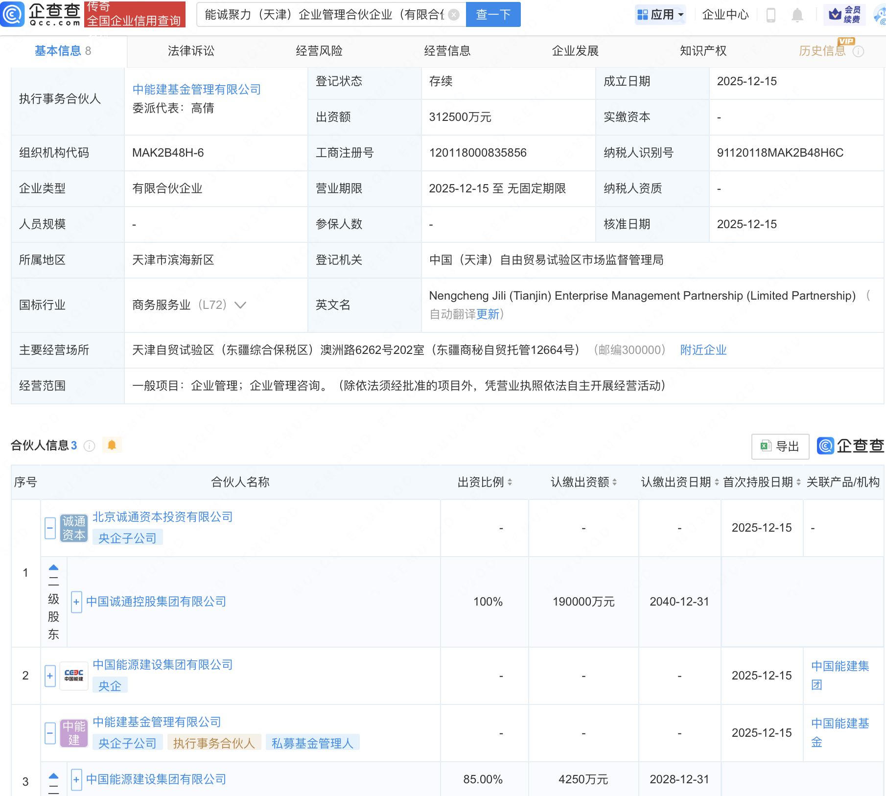 企查查APP显示,近日,能诚聚力(天津)企业管理合伙企业(有限合伙)成立,出资额31.25亿元,经营范围包含:企业管理;企业管理咨询。企查查股权穿透显示,该企业由中国诚通控股集团有限公司全资子公司北京诚通资本投资有限公司、中国能源建设集团有限公司及其旗下中能建基金管理有限公司共同出资。